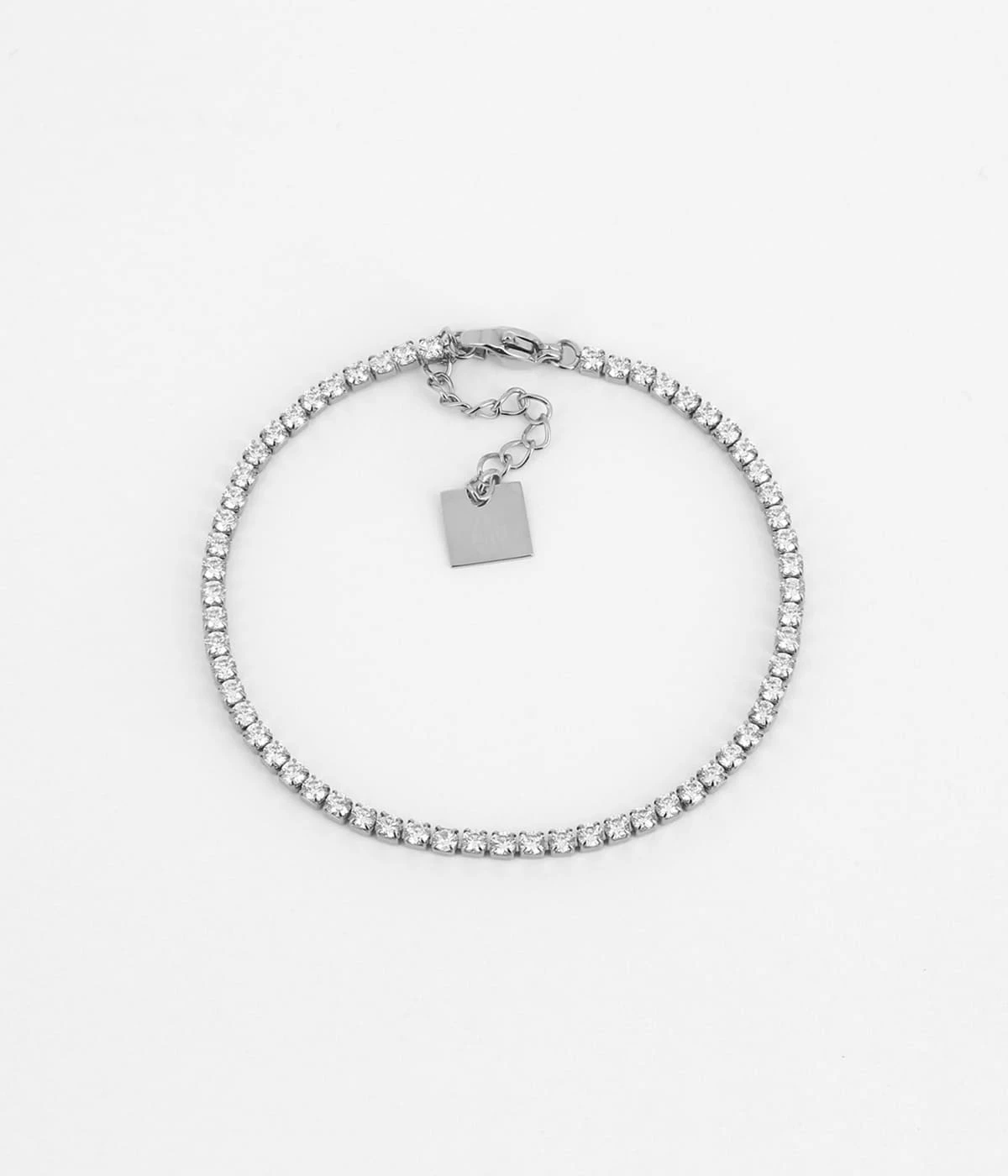 Bracelet en acier dorĂ© Ă l’or fin sur lequel des zirconiums se succĂšdent avec un sertissage carrĂ©.