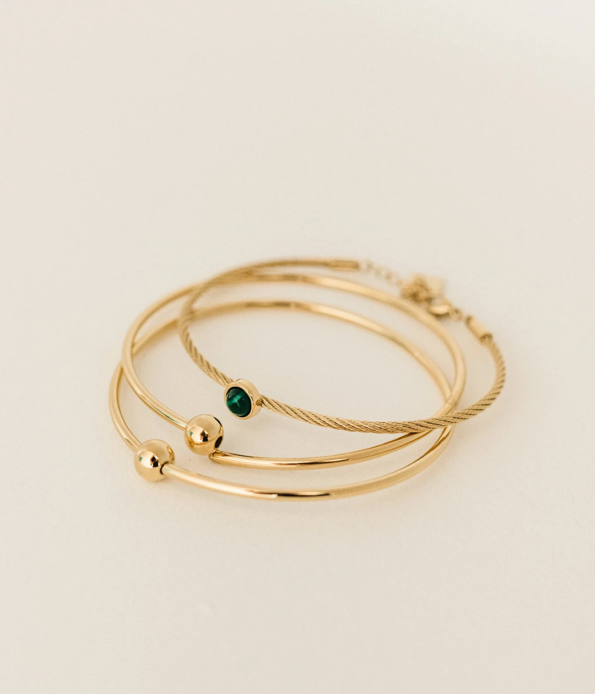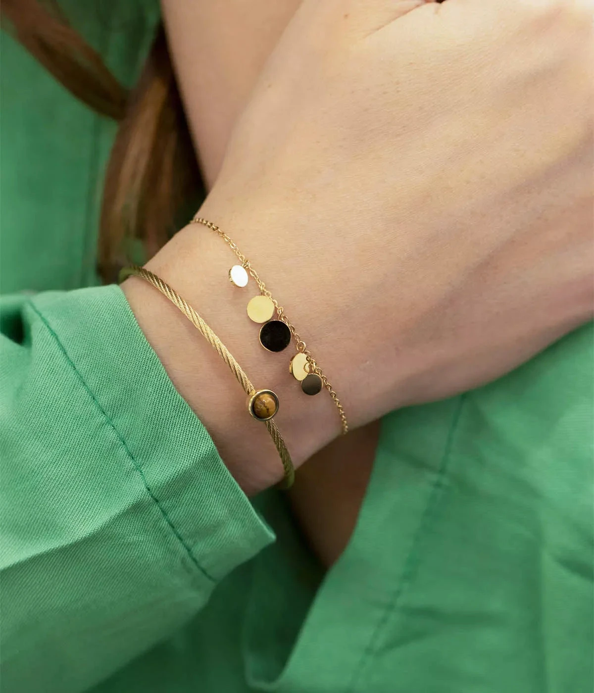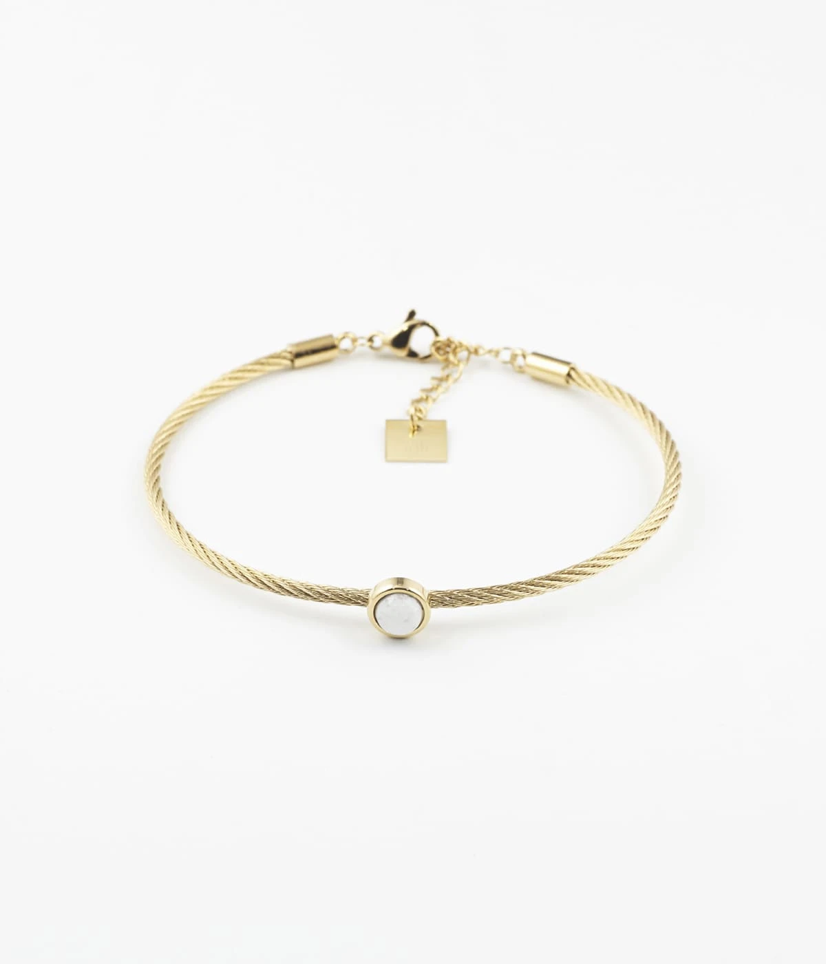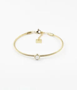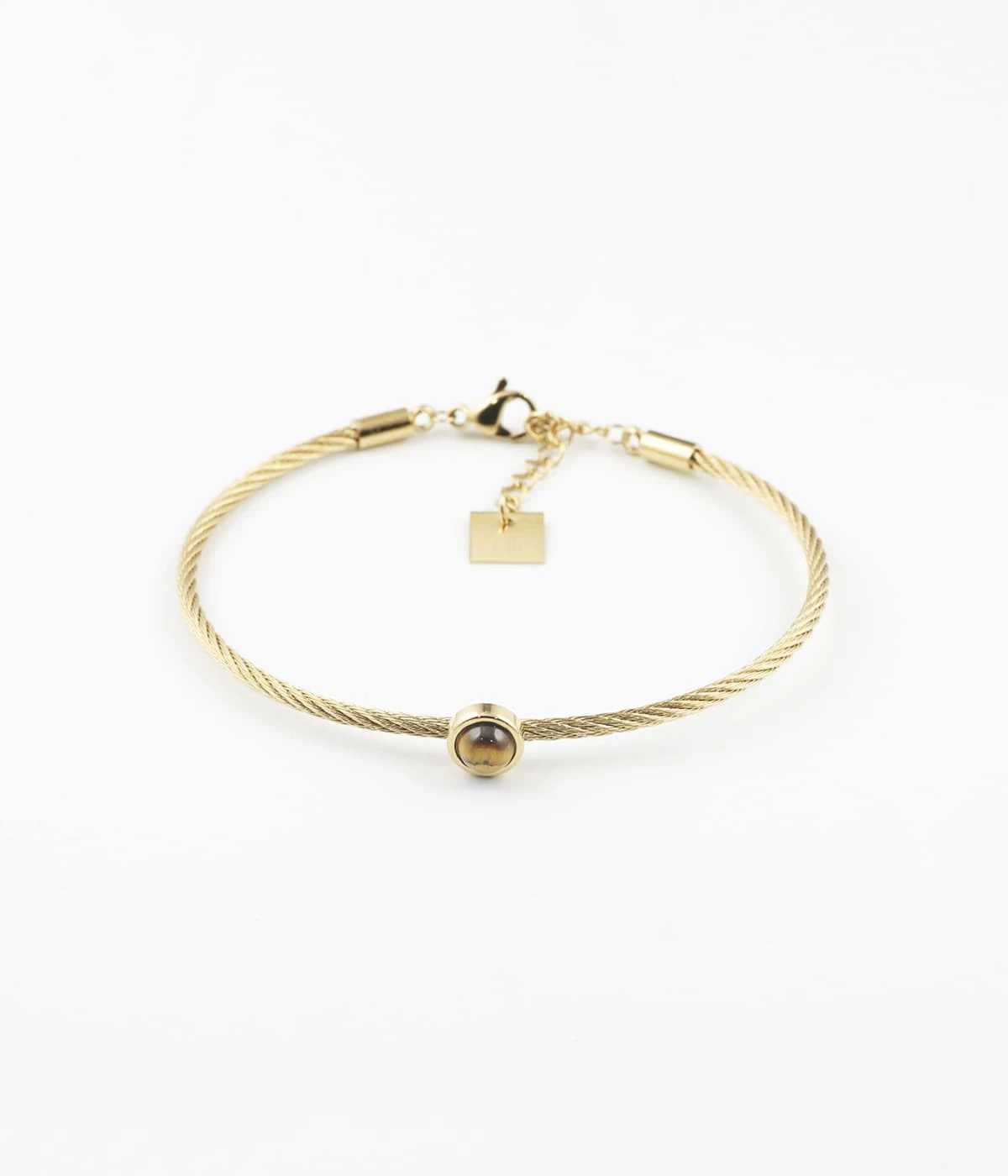 Bracelet jonc en acier dorĂ© Ă l’or fin dont le mĂ©tal est travaillĂ© comme un cĂąble sur lequel est sertie une pierre fine de couleur en cabochon.