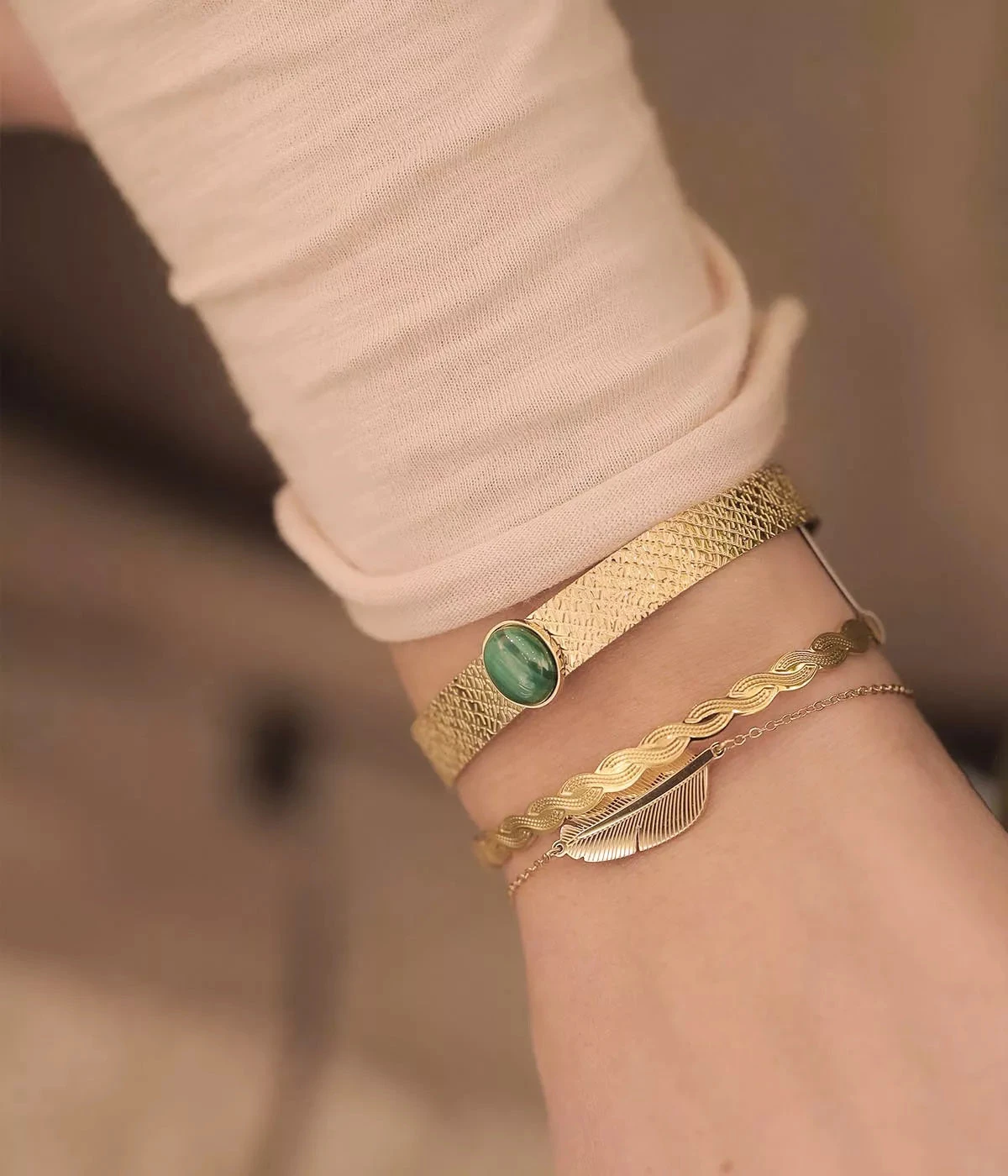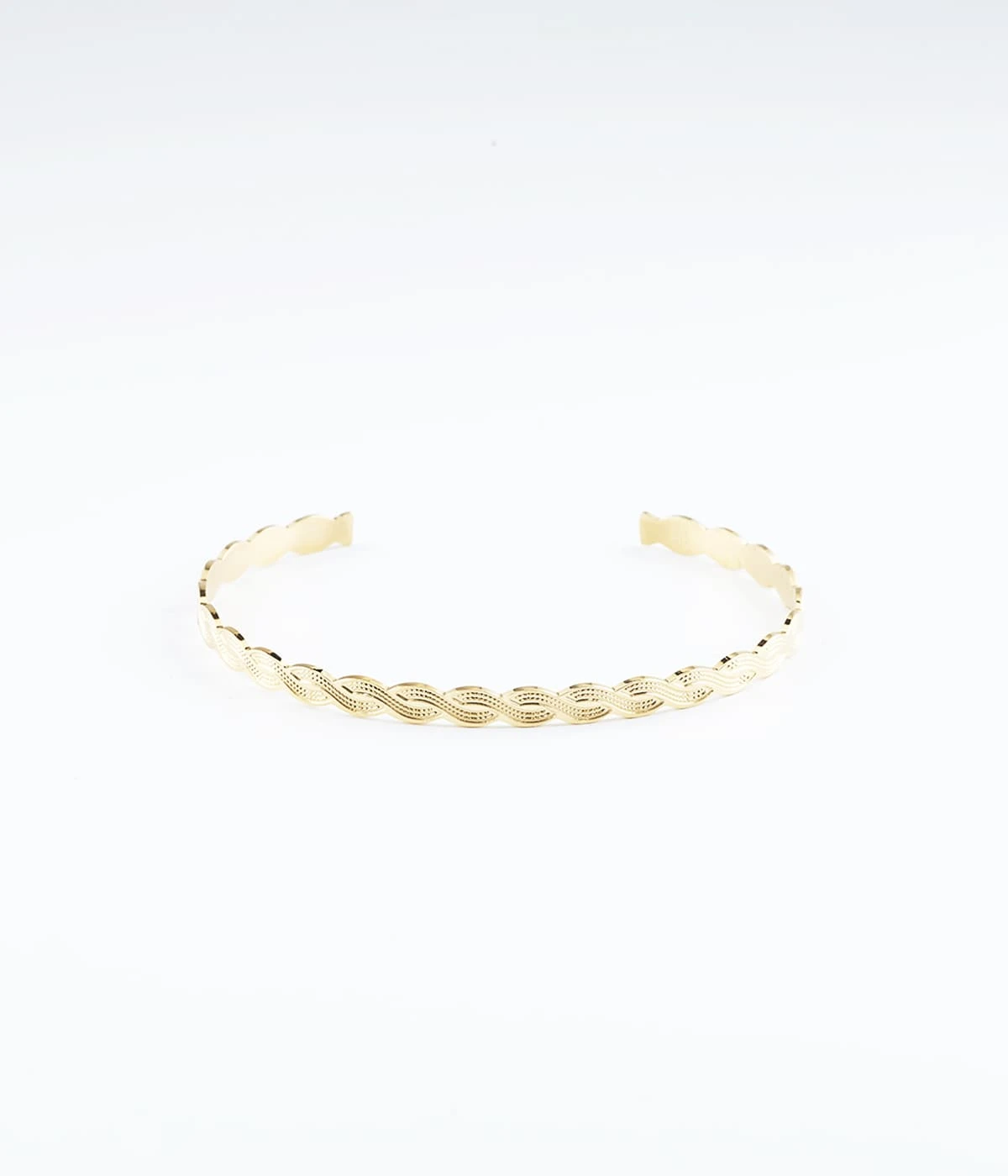 Bracelet jonc en acier uni ou dorĂ© Ă l’or fin dont l’apparence Ă©voque une fine tresse.