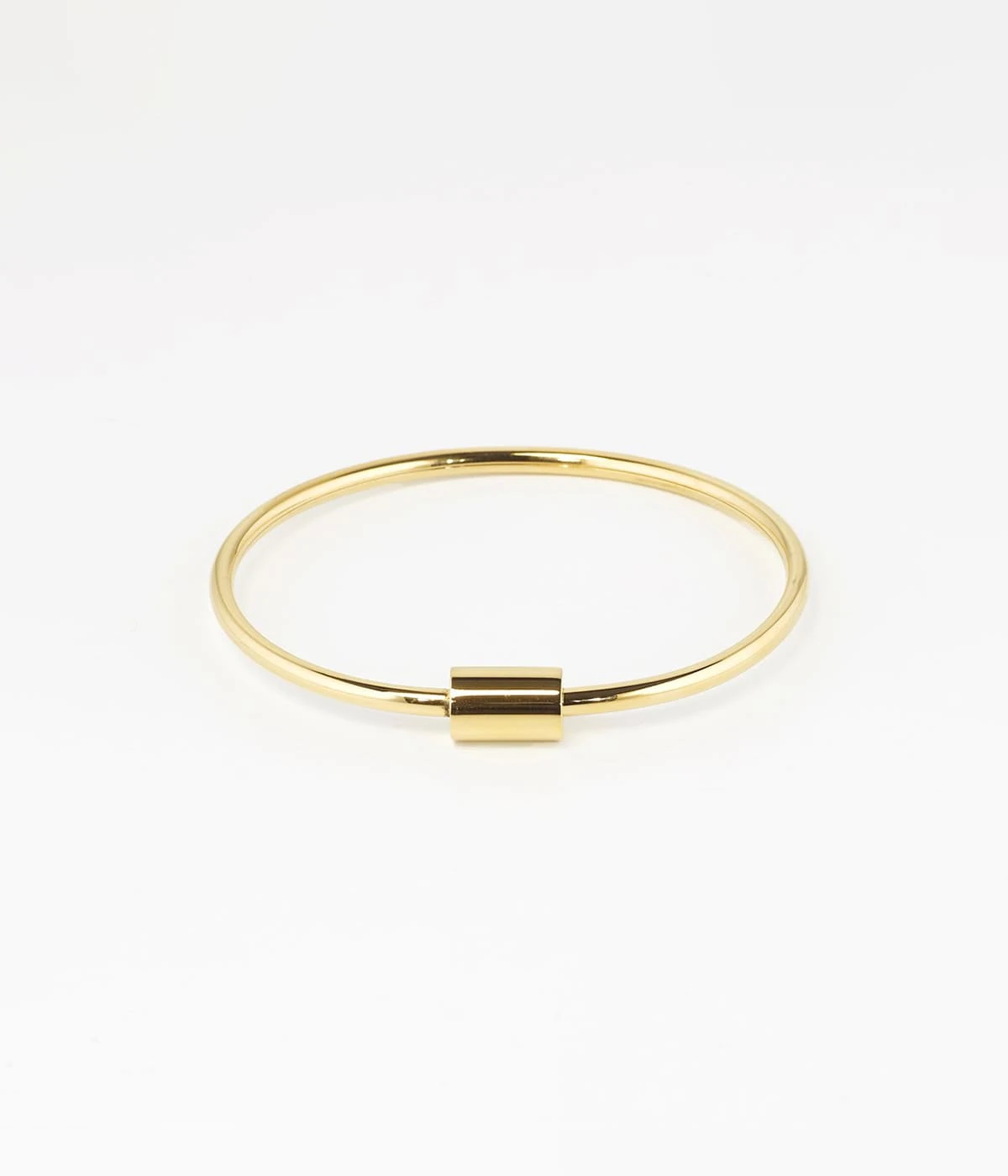 Bracelet jonc en acier uni ou dorĂ© Ă lâor fin. Le mĂ©tal est Ă lâhonneur et en son centre un cylindre dorĂ© fait office de motif.