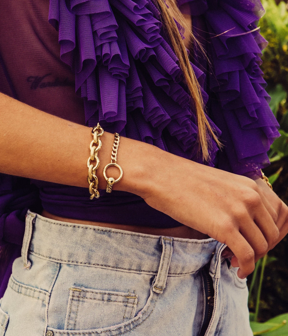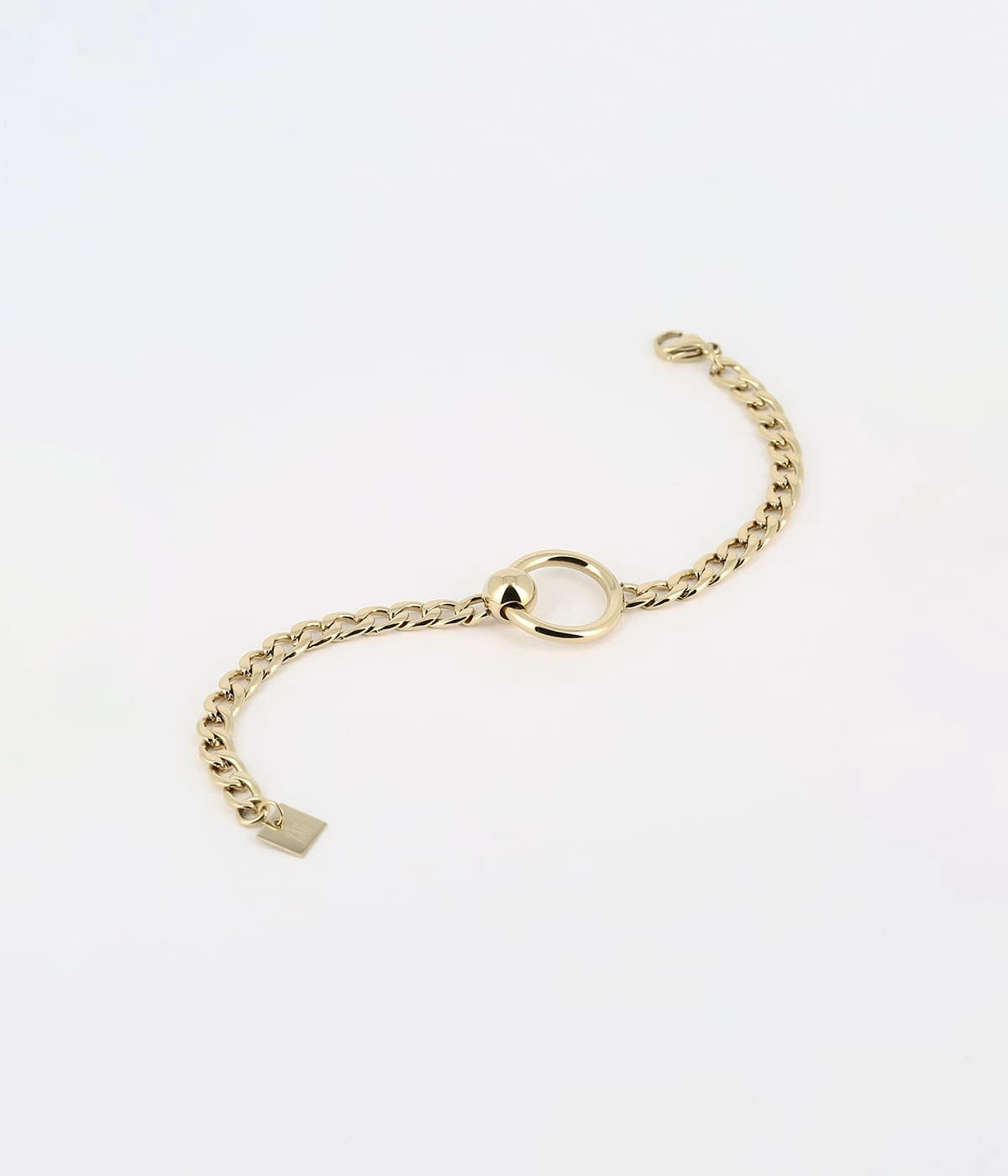 Bracelet Ă maillons en acier uni ou dorĂ© Ă l’or fin au milieu duquel est placĂ© un anneau de mĂ©tal.