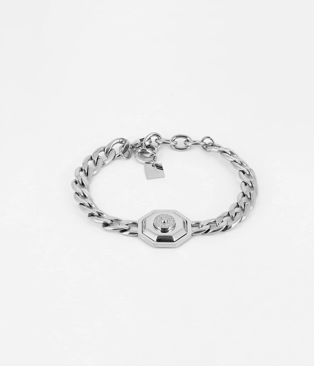 Bracelet maillons en acier uni ou dorĂ© Ă l’or fin avec en son centre un octogone possĂ©dant un cercle serti de zirconiums.