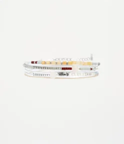 Bracelet multi-rang colorĂ© qui sâenlace deux fois autour du poignet. Sont enfilĂ©es des perles de mĂ©tal et de pierres fines.
