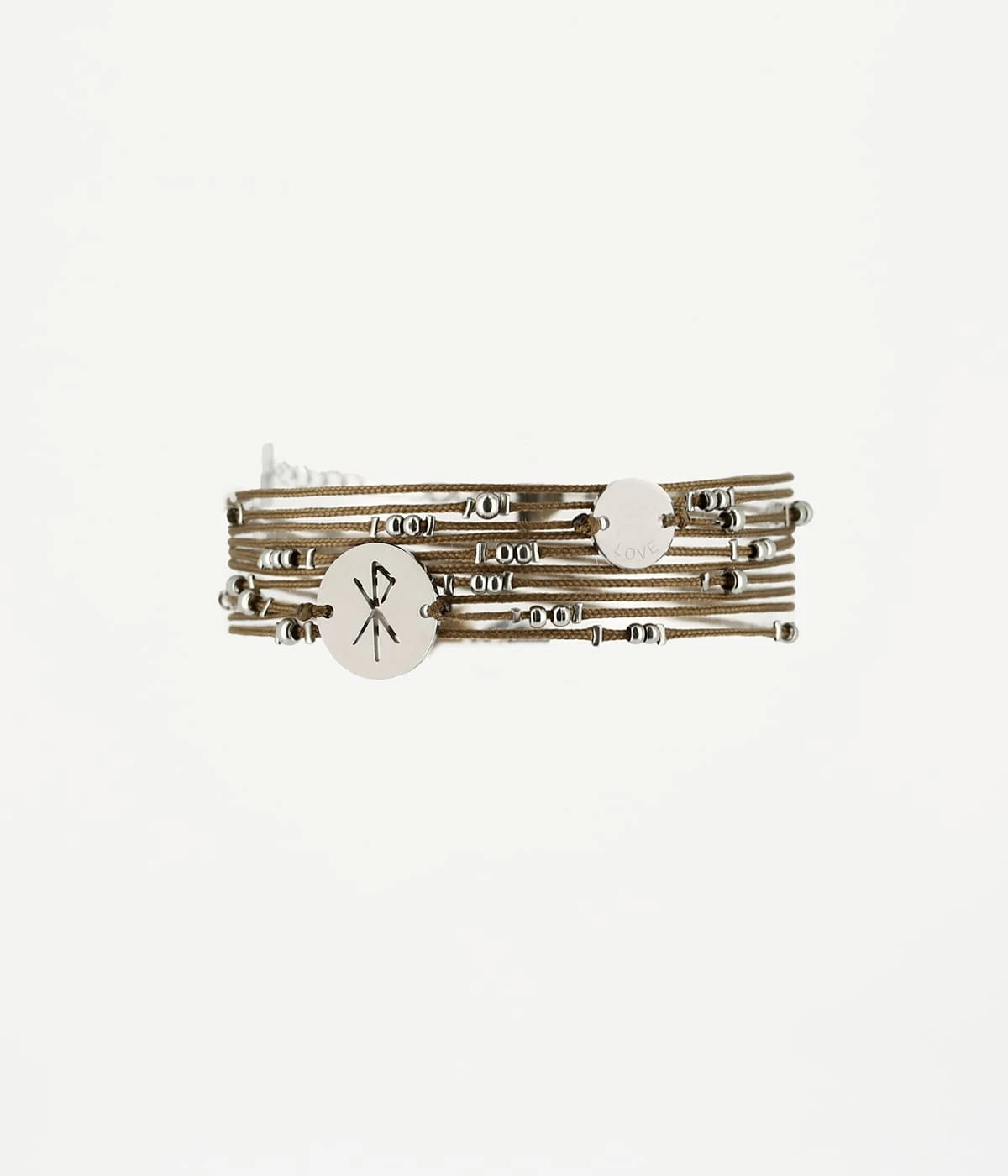 Bracelet cordons sur lesquels sont enfilĂ©es des boules d’acier et des plaques rondes gravĂ©es du mot « Love » et d’une rune.