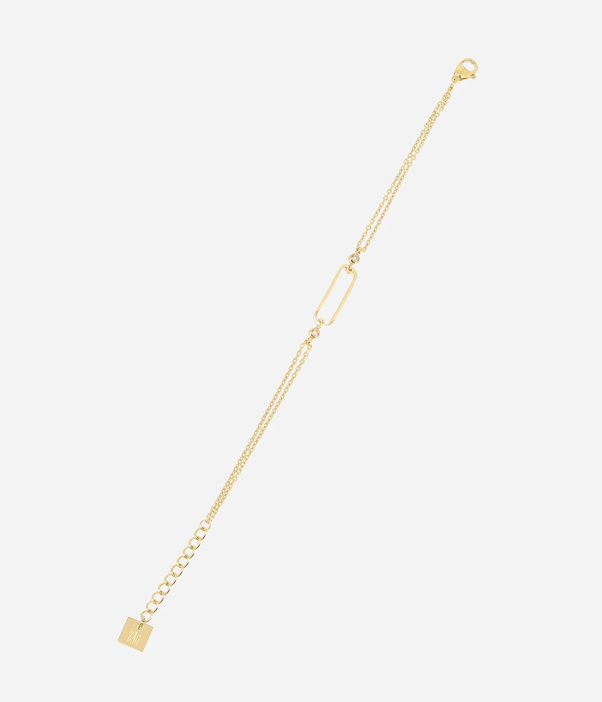 Bracelet en acier dorĂ© Ă l’or fin sur lequel est attachĂ© un motif de forme gĂ©omĂ©trique. Les zirconiums apportent une petite touche d’Ă©clat Ă ce bijou.