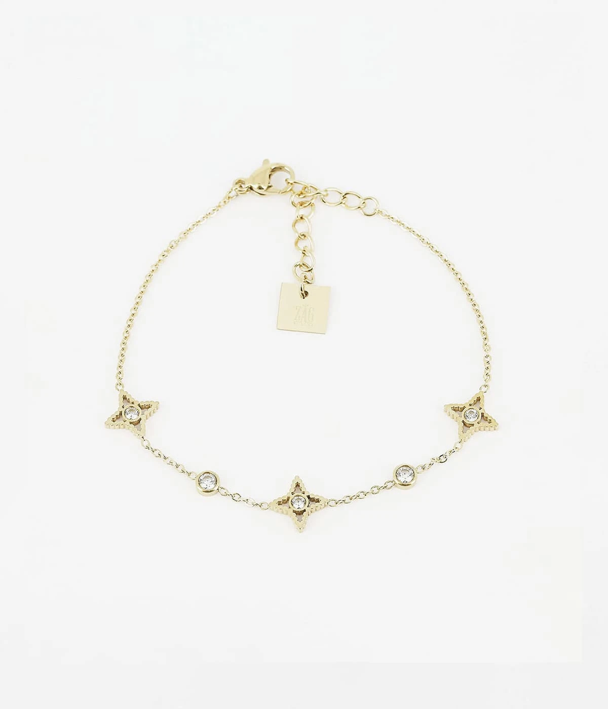 Bracelet chaĂźnette en acier uni ou dorĂ© Ă lâor fin sur lequel sont attachĂ©s des motifs gothiques pavĂ©s de zirconiums brillants.