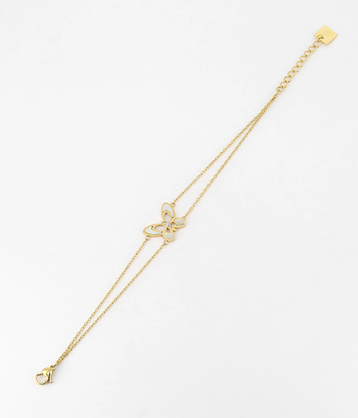Bracelet en acier doré à double rang sur lequel un motif papillon aux ailes colorées est attaché.