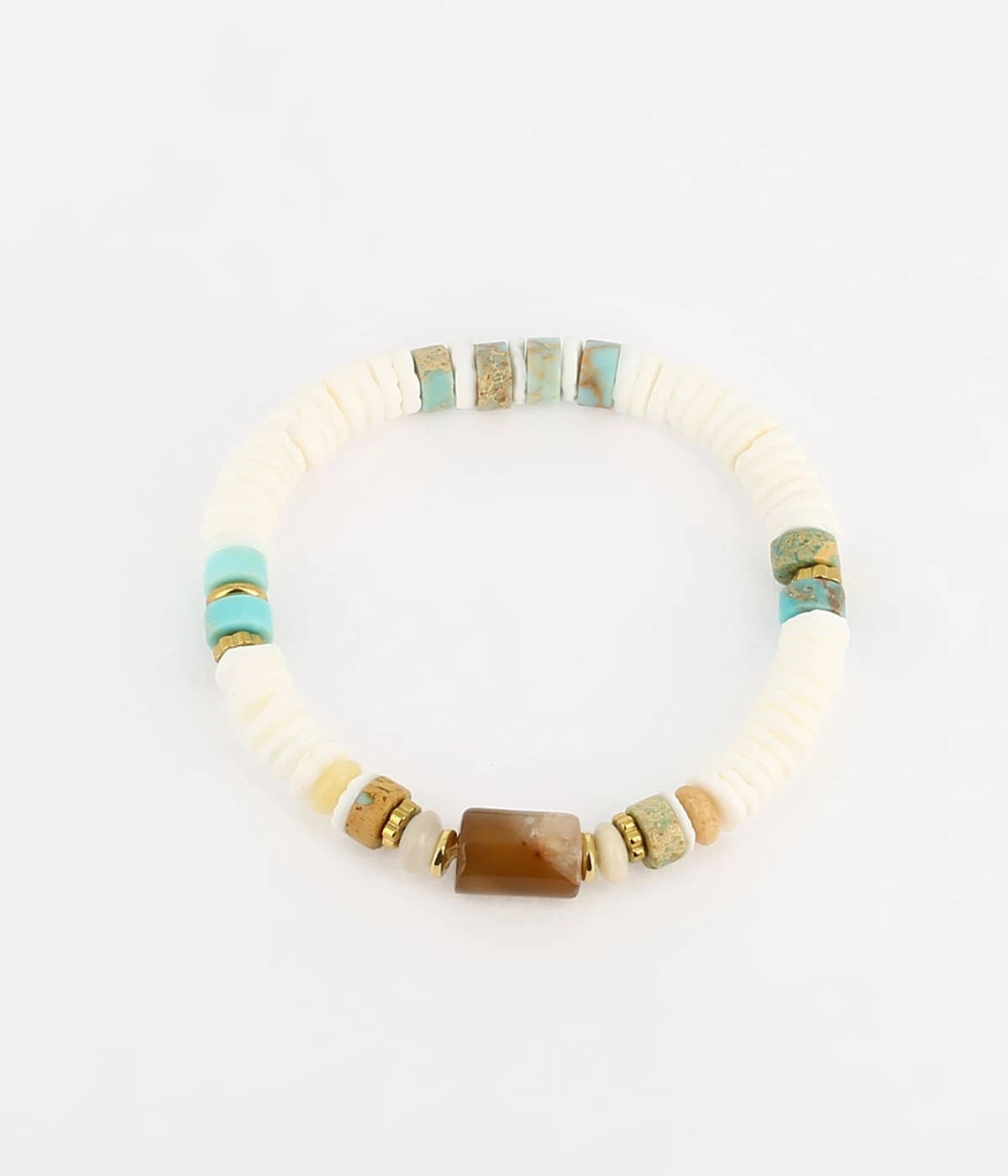 Bracelet Ă©lastique sur lequel sont montĂ©es des rondelles d’howlite accompagnĂ©es d’une petite touche d’acier dorĂ© et de pierres fines.
