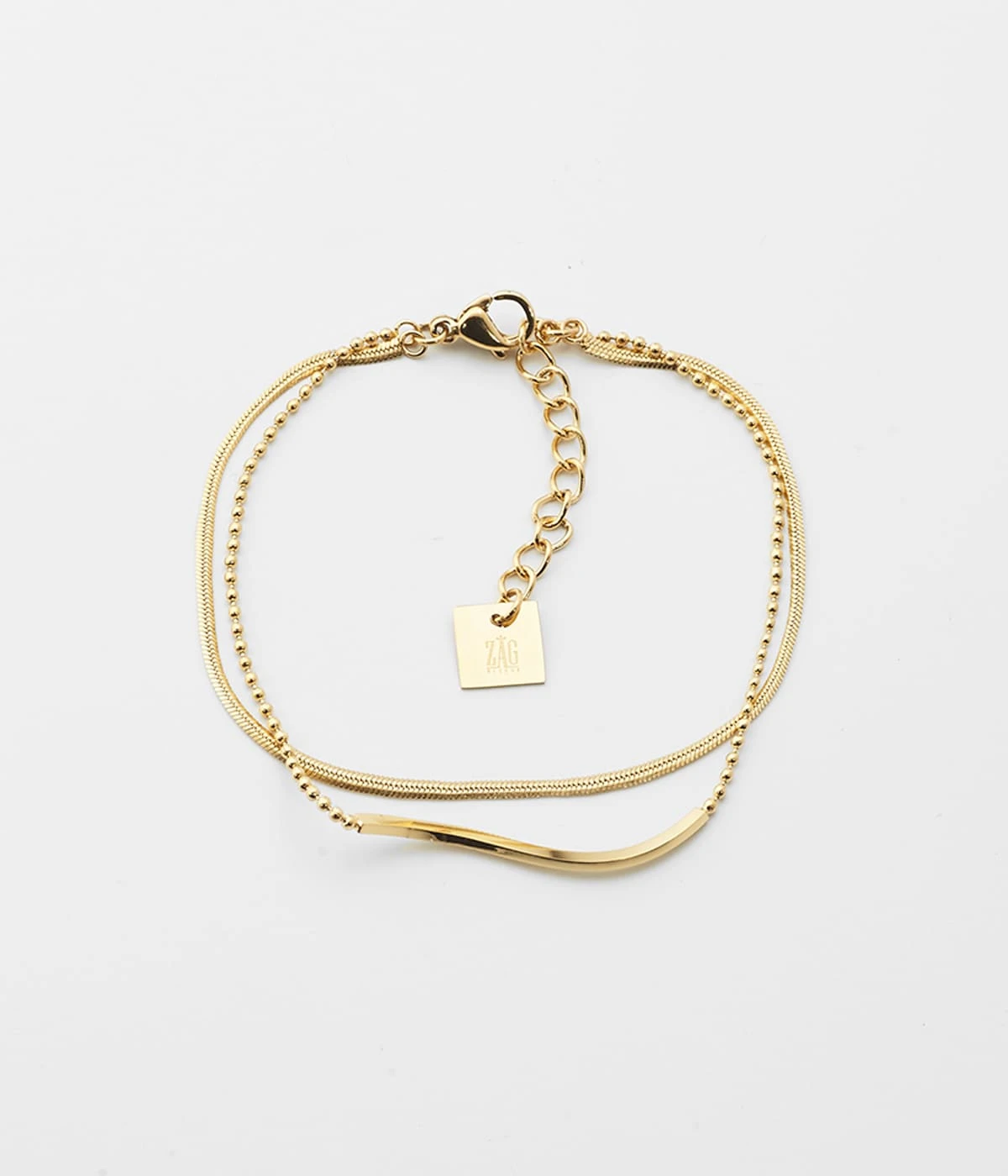 Bracelet double chaĂźne en acier uni ou dorĂ© Ă l’or fin dont la premiĂšre chaĂźne est une maille serpent classique et dont la seconde, formĂ©e de petites boules, est dĂ©corĂ©e d’une petite barre courbĂ©e.