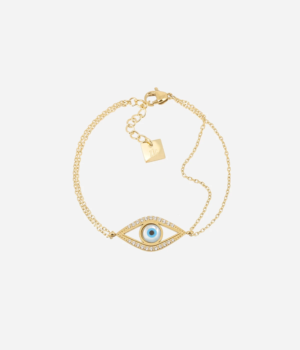 Bracelet Ă double chaĂźne sur lequel un motif d’oeil pavĂ© de zirconiums est attachĂ©.