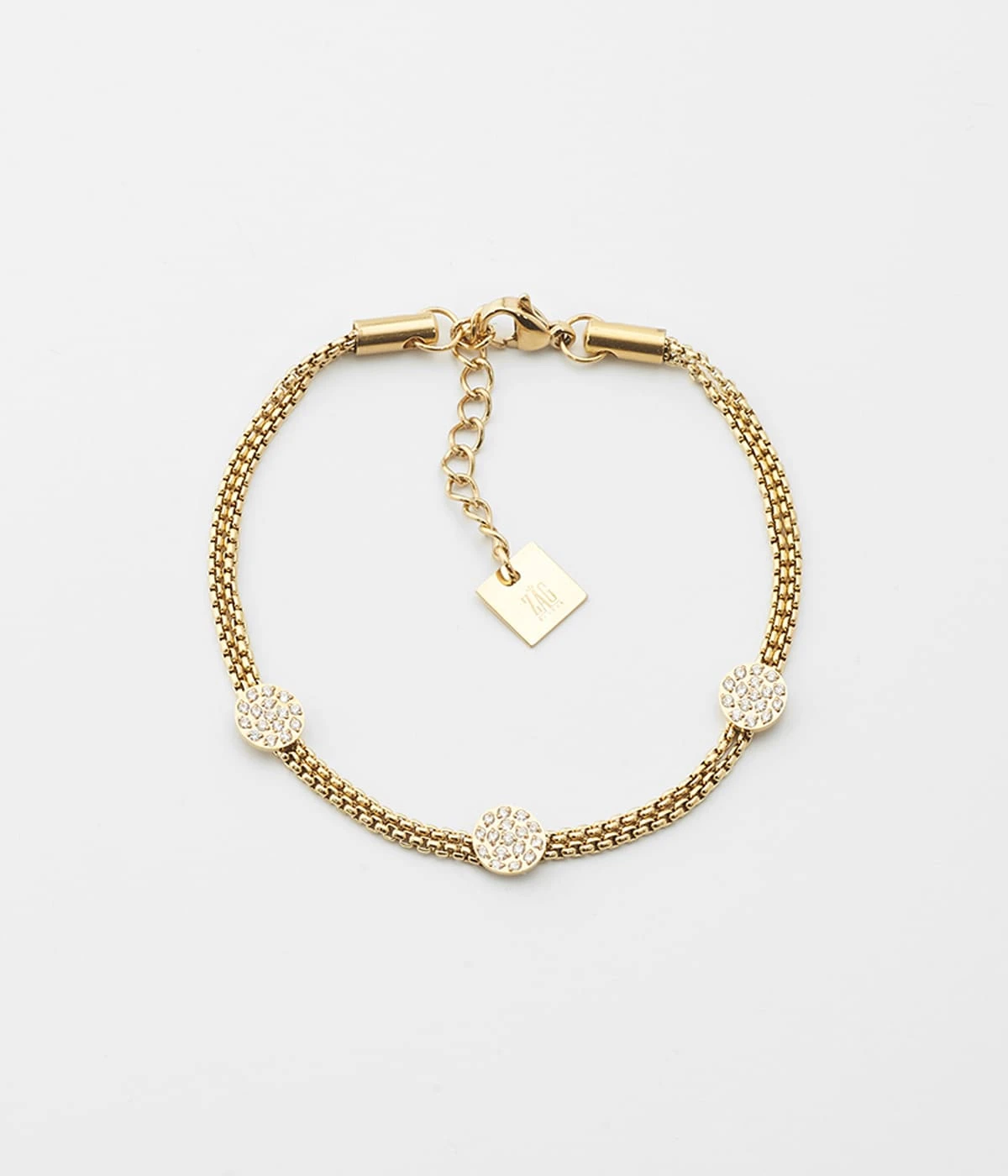 Bracelet chaĂźne « ancienne » en acier uni ou dorĂ© Ă l’or fin parsemĂ© de trois cercles sertis de zirconiums.