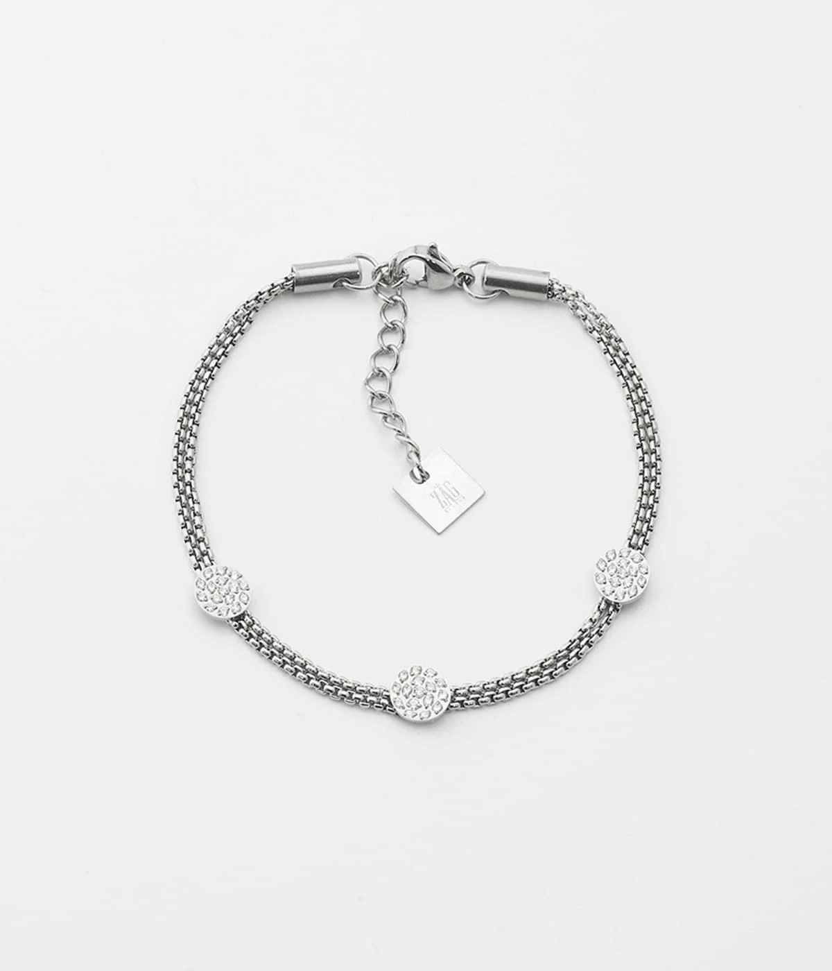 Bracelet chaĂźne « ancienne » en acier uni ou dorĂ© Ă l’or fin parsemĂ© de trois cercles sertis de zirconiums.