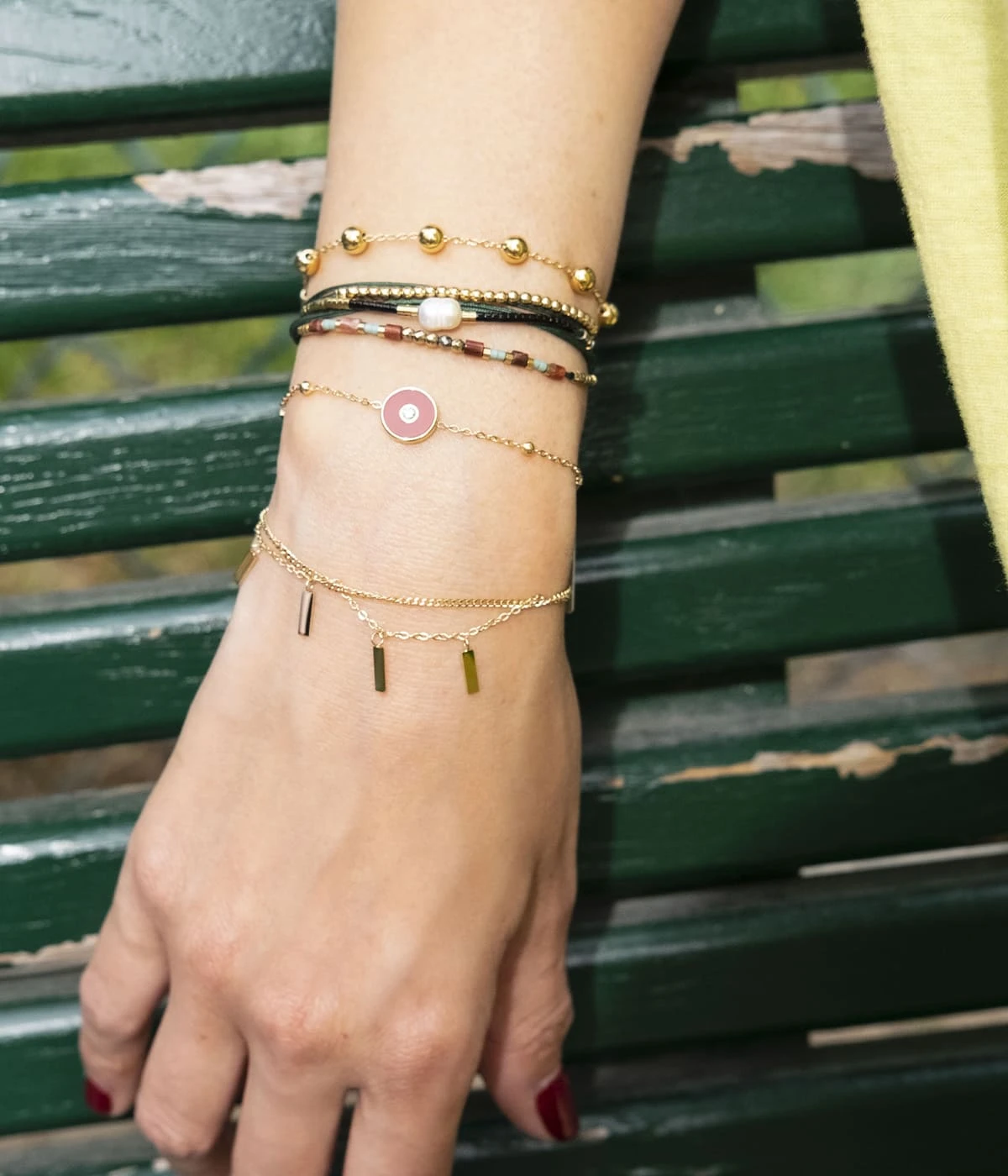 Bracelet cordons multi-rang colorĂ© sur lequel sont enfilĂ©es une perle dâeau douce et des boules d’acier dorĂ© Ă l’or fin.