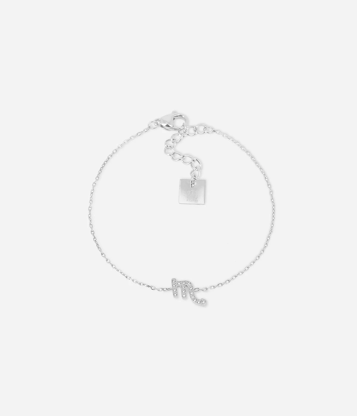 Bracelet en acier uni sur lequel est attaché un motif représentant le signe du zodiaque Scorpion, serti de zirconiums.