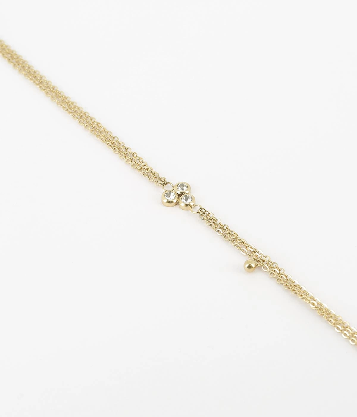 Bracelet multi chaĂźne en acier dorĂ© Ă lâor fin sur lequel est attachĂ© un trio de zirconium montĂ©s en serti-clos.