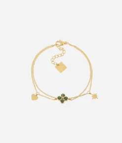 Bracelet Ă double rang sur lequel se trouve de la pierre naturelle et des pendentifs en forme de coeur et d’Ă©toile.