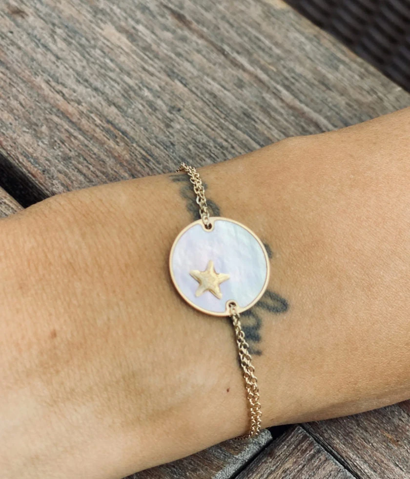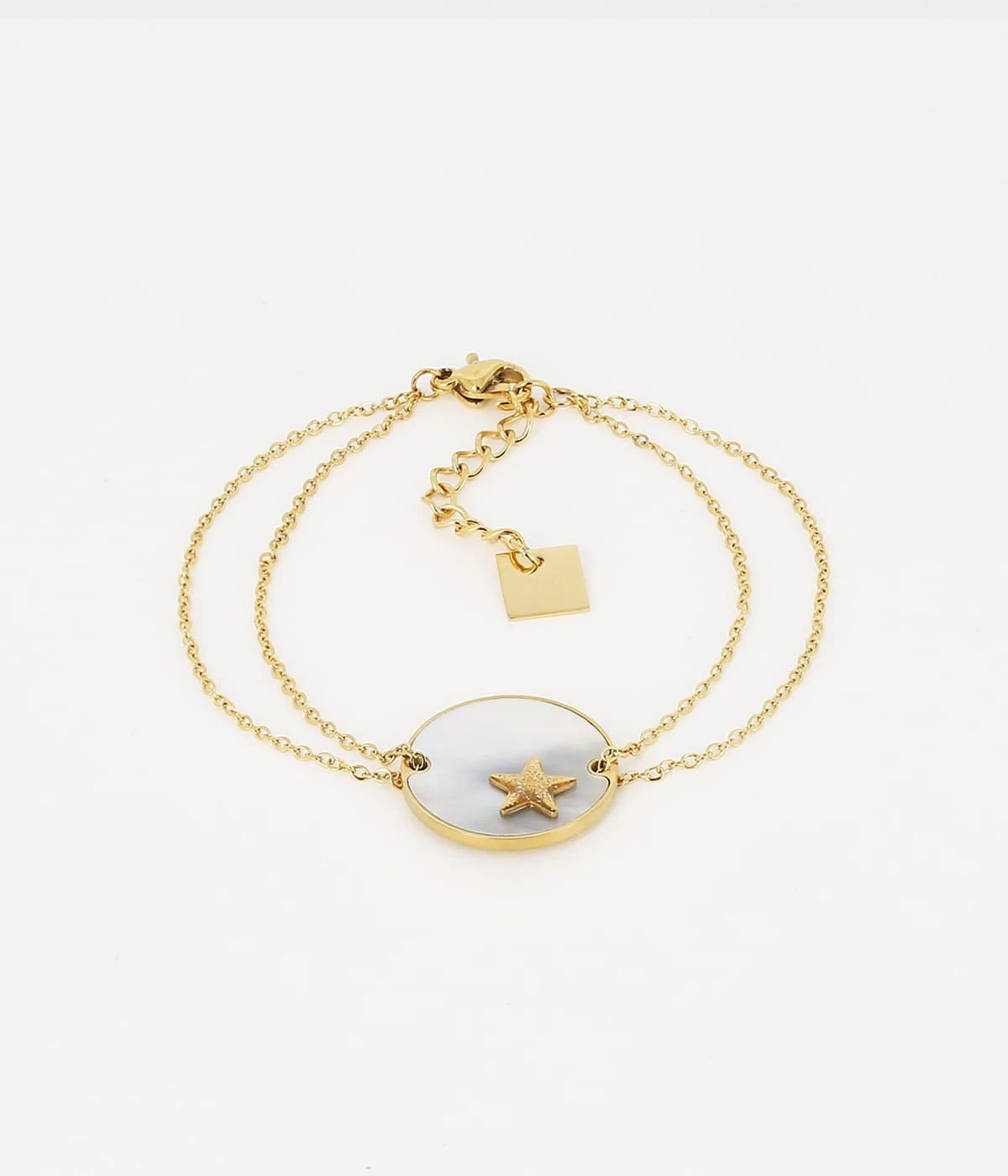 Bracelet double chaĂźnette, en acier dorĂ© Ă lâor fin, agrĂ©mentĂ© dâune mĂ©daille de nacre sur laquelle est piquĂ© un motif dâĂ©toile de mer.