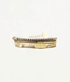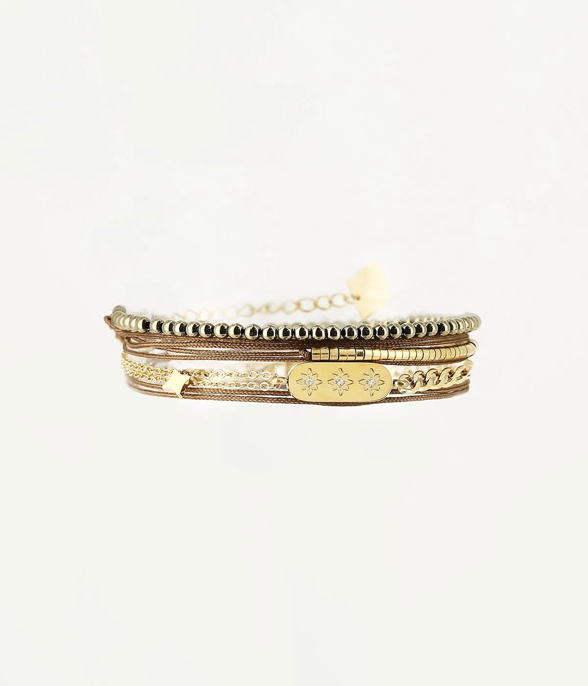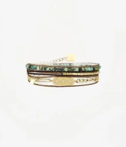 Bracelet multi-rang sur lequel sont enfilĂ©es des perles de pierres naturelles et une plaque de mĂ©tal gravĂ© de motifs en forme dâĂ©toile.
