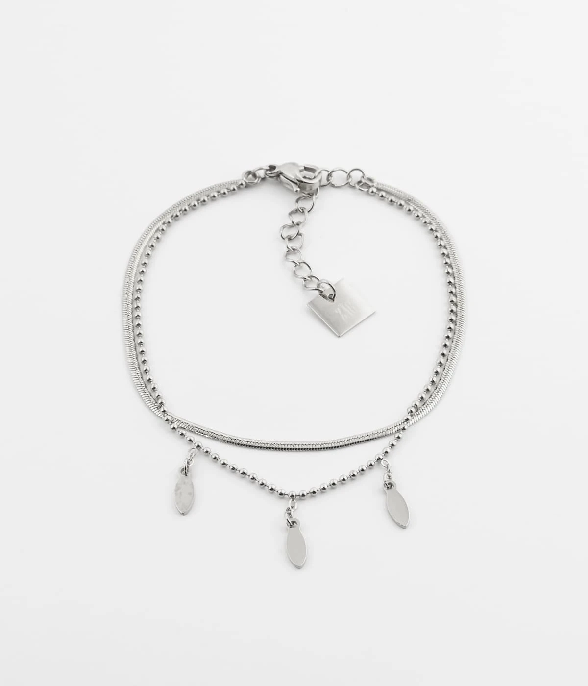 Bracelet double chaĂźnette en acier uni ou dorĂ© Ă l’or fin constituĂ© d’une chaĂźne en petites boules soudĂ©es Ă la main mĂ©langĂ©e Ă une chaĂźne maille serpent, le tout ornĂ© de trois pampilles de mĂ©tal Ă l’apparence de feuilles.