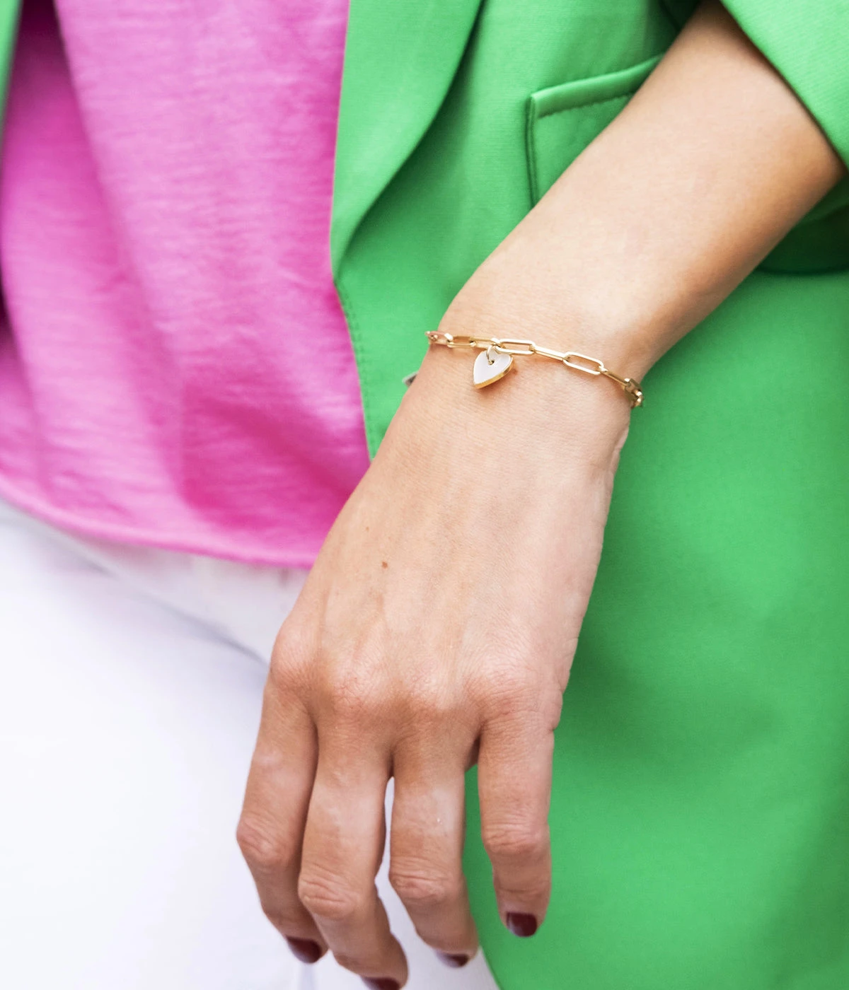 Bracelet chaĂźnette sur lequel est attachĂ© un petit cĆur en nacre.