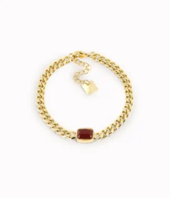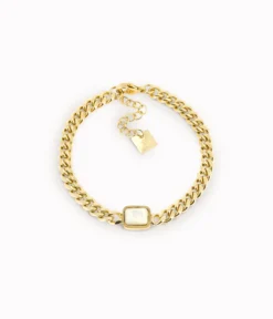 Bracelet gourmette en acier uni ou dorĂ© Ă l’or fin sur lequel est sertie une pierre rectangulaire.