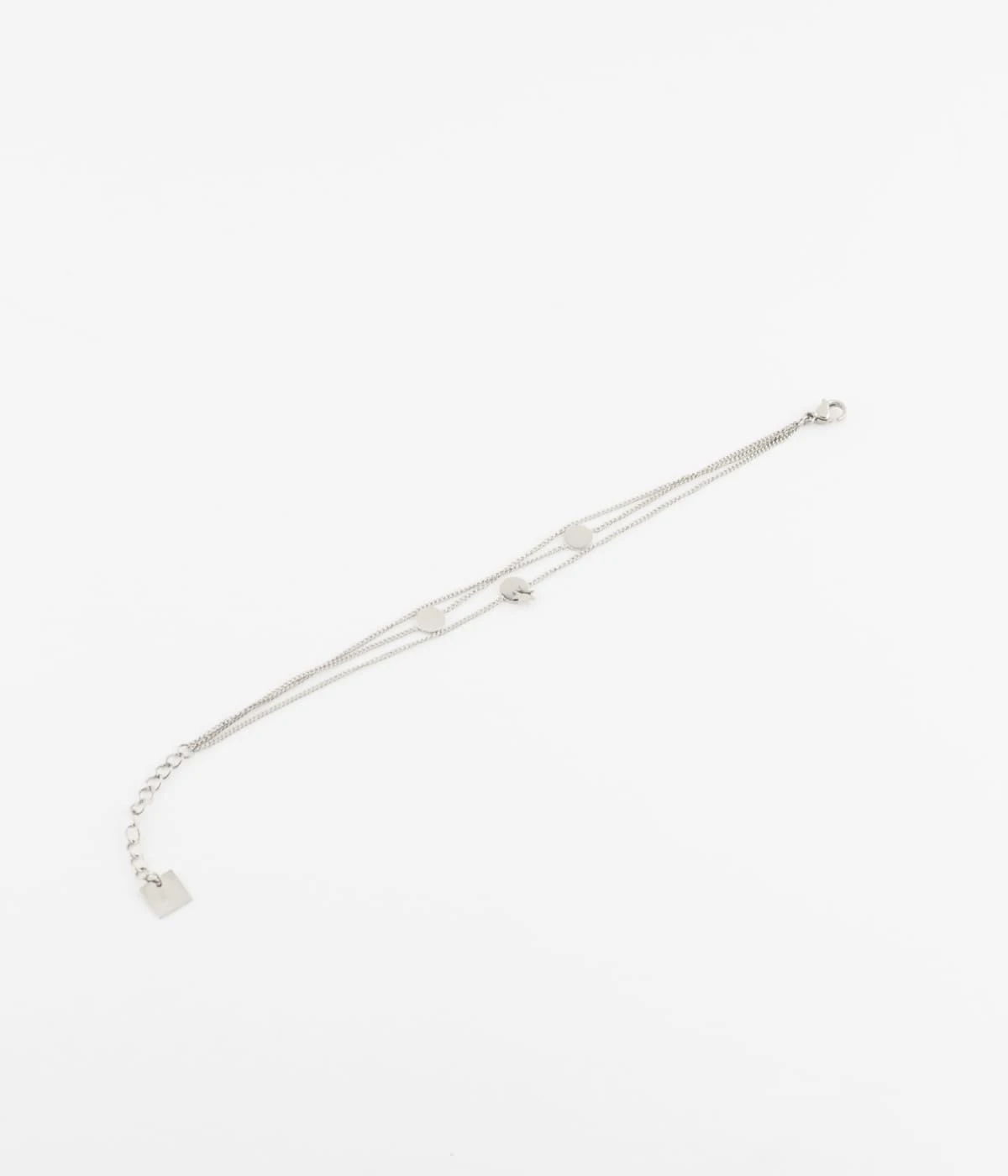 Bracelet double chaĂźne en acier uni ou dorĂ© Ă l’or fin parsemĂ© de trois petites mĂ©dailles en mĂ©tal dont celle du centre est dĂ©corĂ©e d’un motif d’Ă©toile.