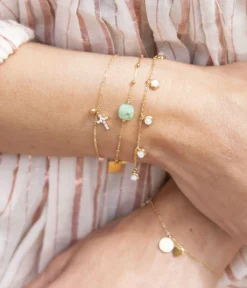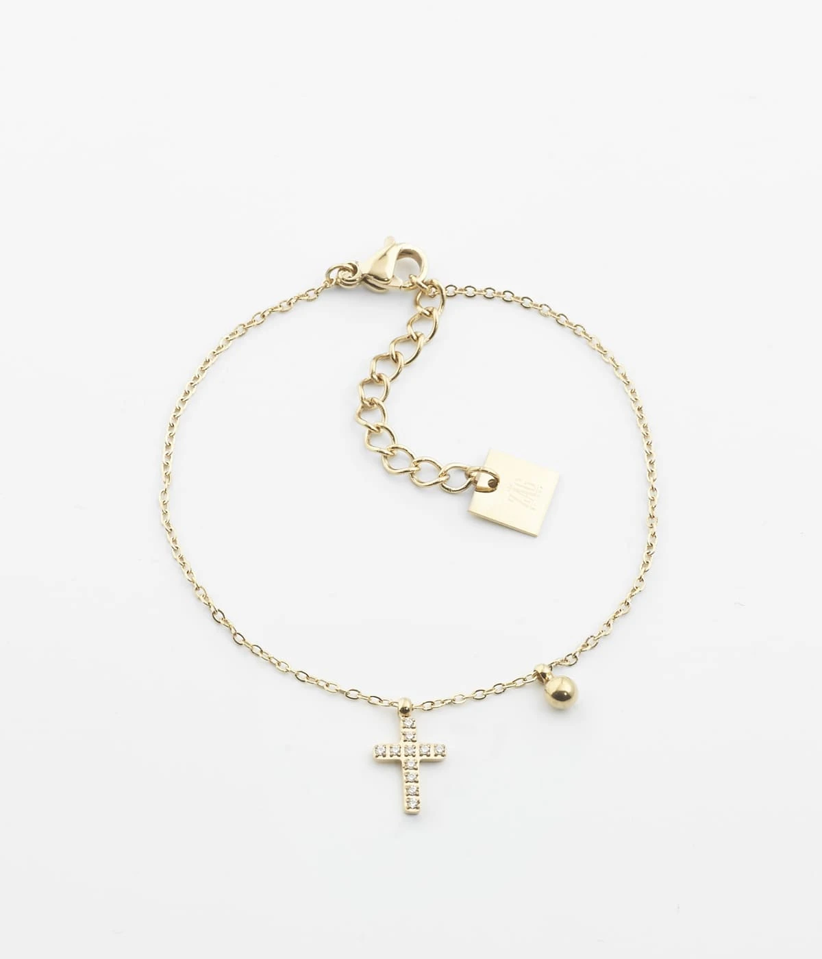 Bracelet chaĂźnette en acier uni ou dorĂ© Ă l’or fin sur lequel sont attachĂ©es une petite croix sertie de zirconiums et une petite boule dorĂ©e.
