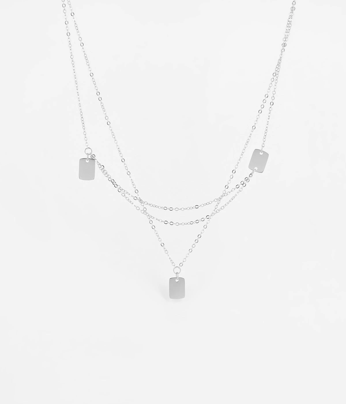 Collier multi rang en acier uni ou dorĂ© Ă l’or fin sur lequel sont suspendus des pendentifs de forme gĂ©omĂ©trique.