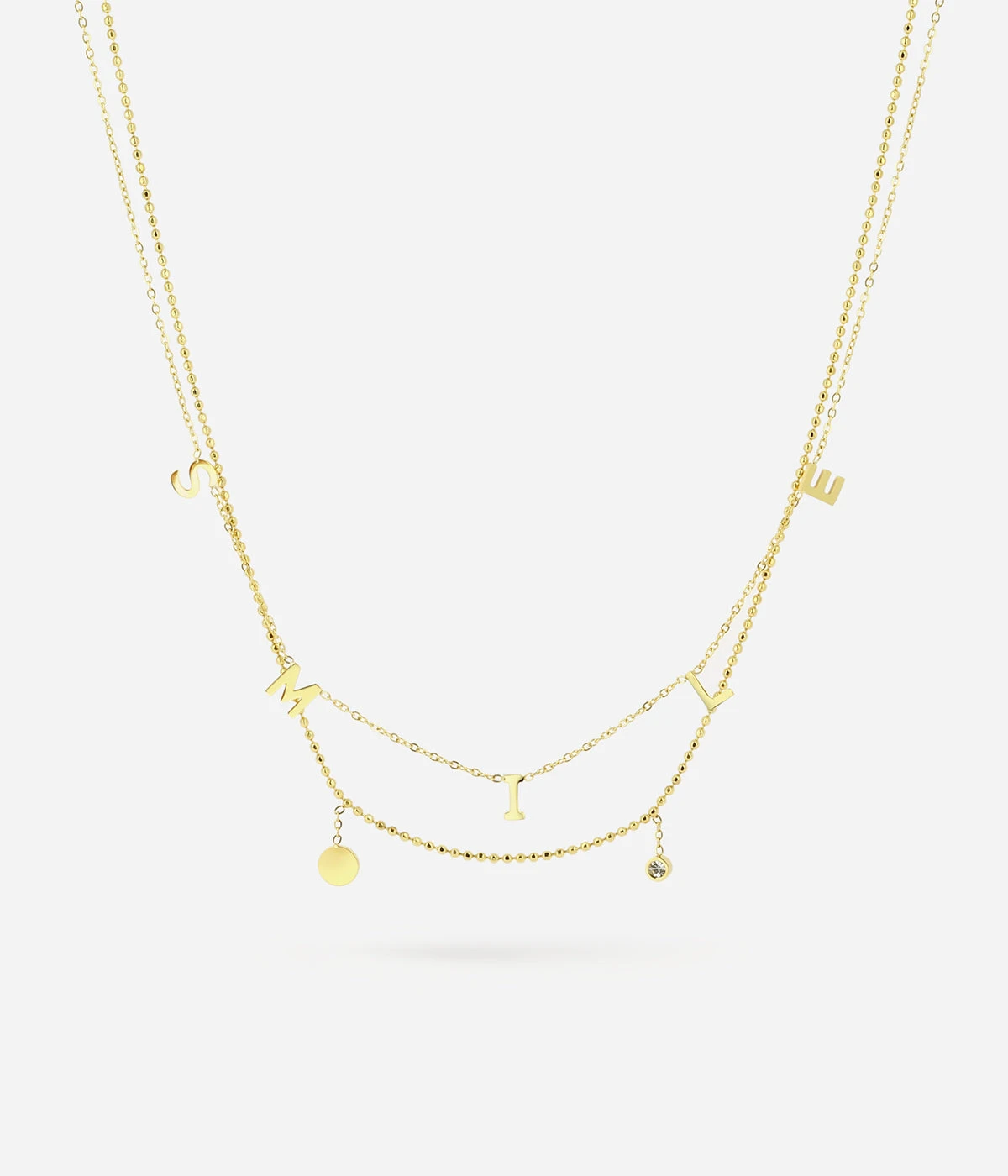 L’une des chaînes est composée du mot SMILE et sur l’autre chaîne sont suspendus un zirconium et une pampille.
