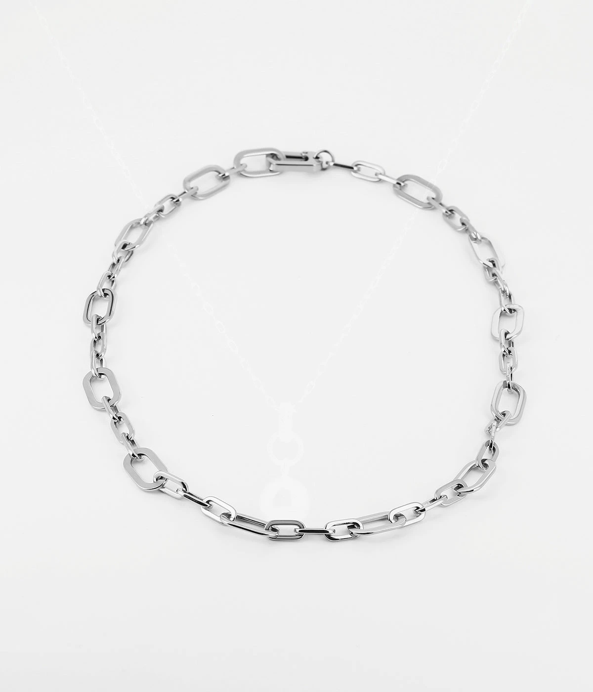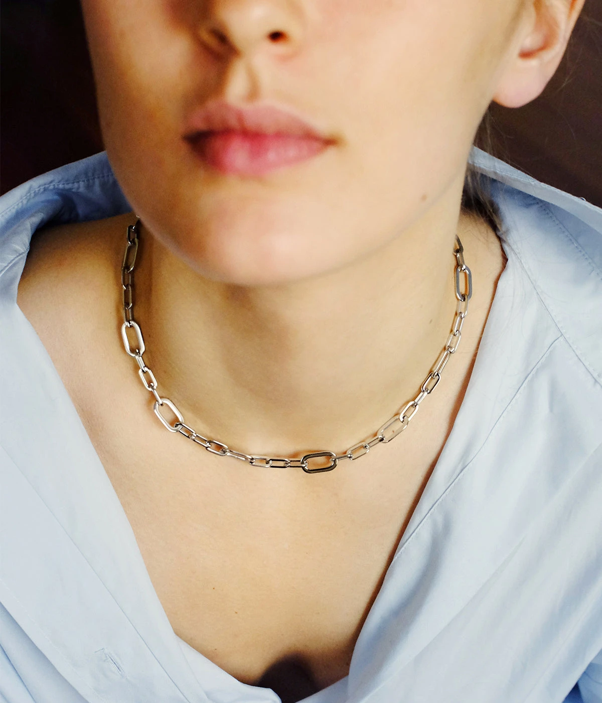 Collier chaĂźne formĂ© de maillons graphiques en acier uni ou dorĂ© Ă lâor fin.
