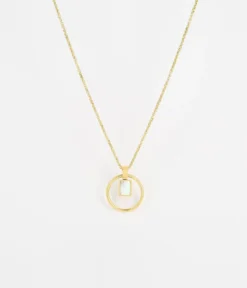 Collier en acier uni ou dorĂ© Ă l’or fin sur lequel est suspendu un pendentif composĂ© d’un cercle en acier avec en son centre un rectangle en nacre.
