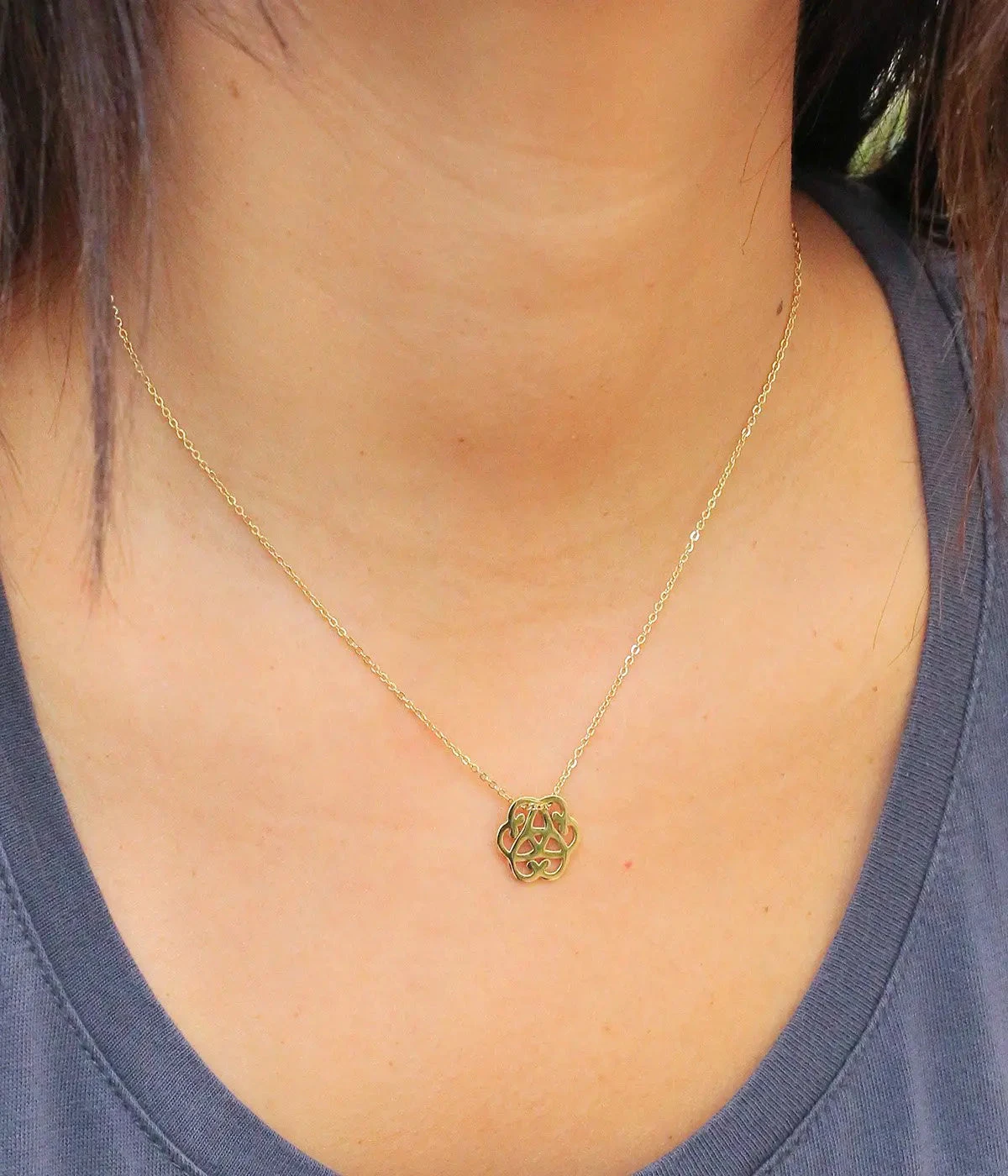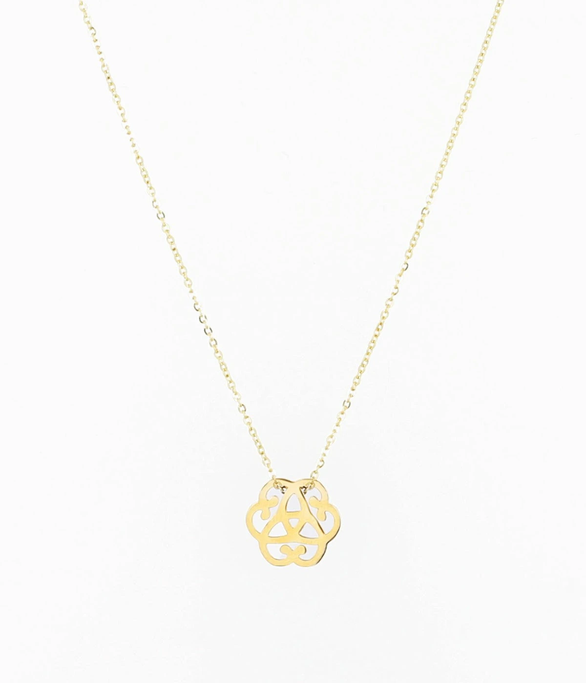 Collier en acier uni ou dorĂ© Ă l’or fin prĂ©sentant un motif d’arabesque en son centre.