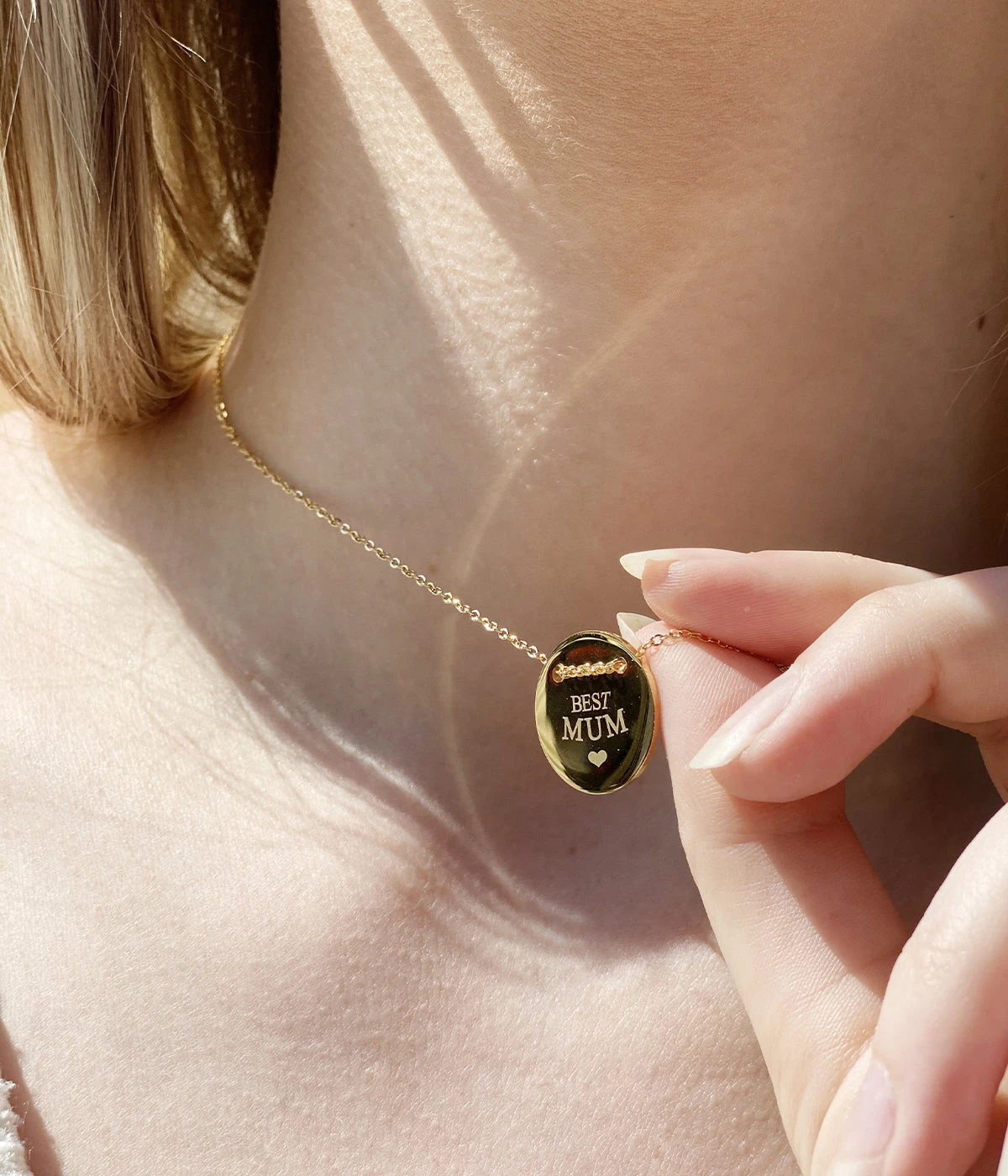 Collier en acier uni ou dorĂ© Ă lâor fin sur lequel une mĂ©daille gravĂ©e du mot « Best Mum » est attachĂ©e.