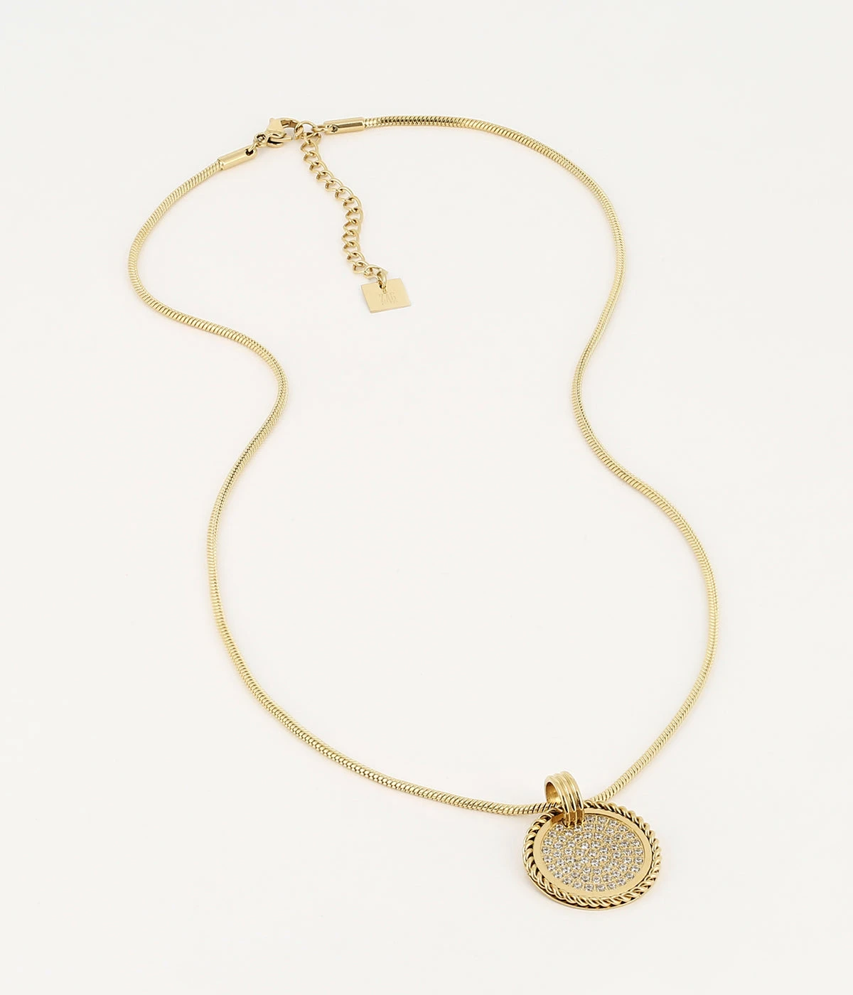 Collier en acier dorĂ© Ă lâor fin sur lequel est suspendu un pendentif serti de zirconiums.