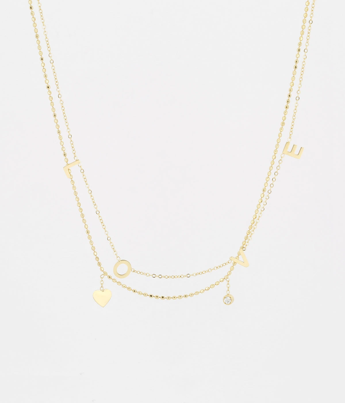 L’une des chaĂźnes est composĂ©e du mot LOVE et sur l’autre chaĂźne sont suspendus un zirconium et une pampille en forme de cĆur.Â