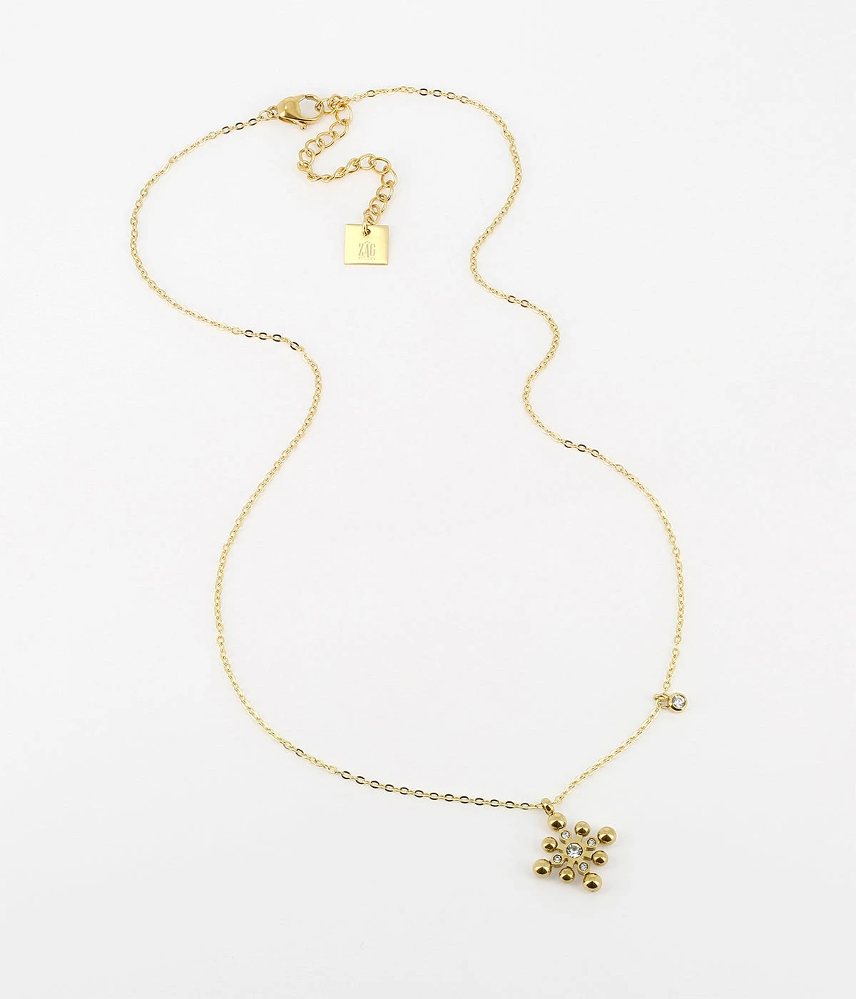 Collier en acier uni ou dorĂ© Ă l’or fin en forme de carrĂ© composĂ© par de petites boules ornĂ© au centre d’un zirconium. Un petit zirconium est Ă©galement attachĂ©.