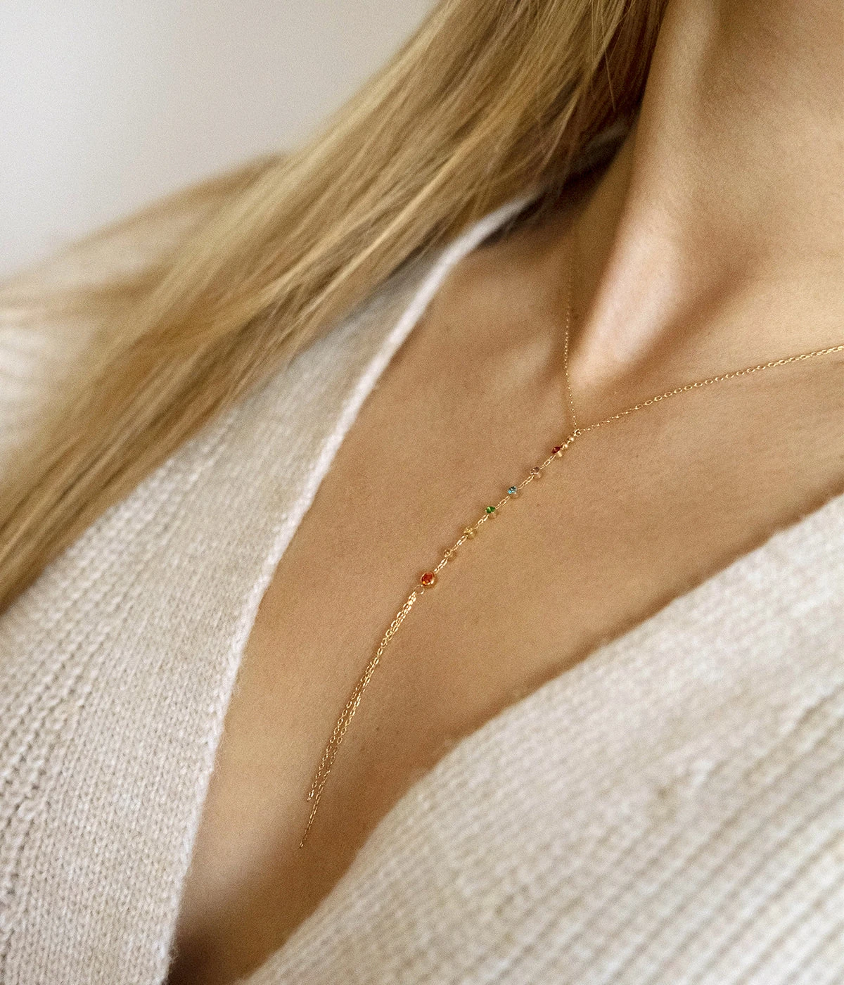 Collier en acier dorĂ© Ă l’or fin en Y sur lequel se trouvent des petites pampilles en zirconiums colorĂ©s reprĂ©sentant les 7 chakras : racine, sacrĂ©, plexus solaire, cĆur, gorge, 3Ăšme Ćil et couronne.