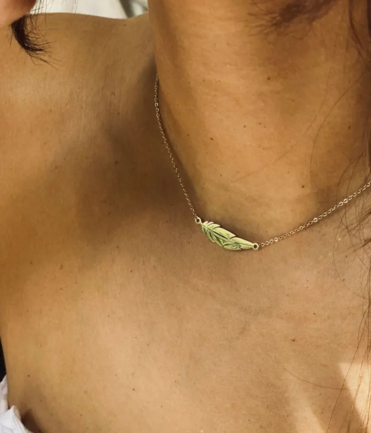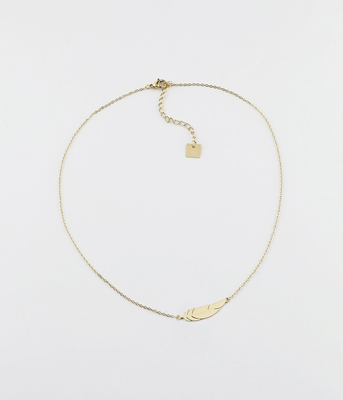 Collier chaĂźne en acier uni ou dorĂ© Ă l’or fin sur lequel est attachĂ© un motif de plume ciselĂ©.