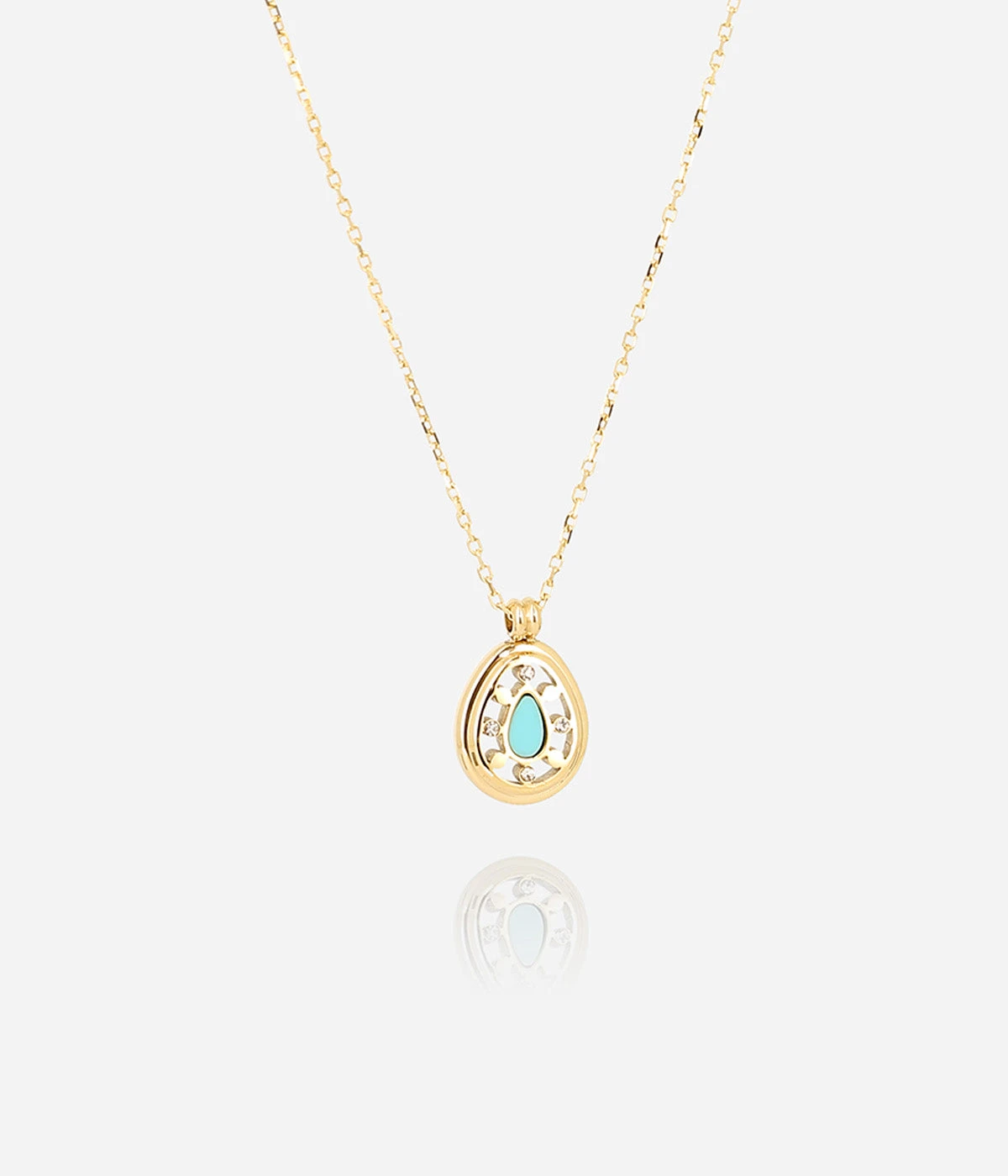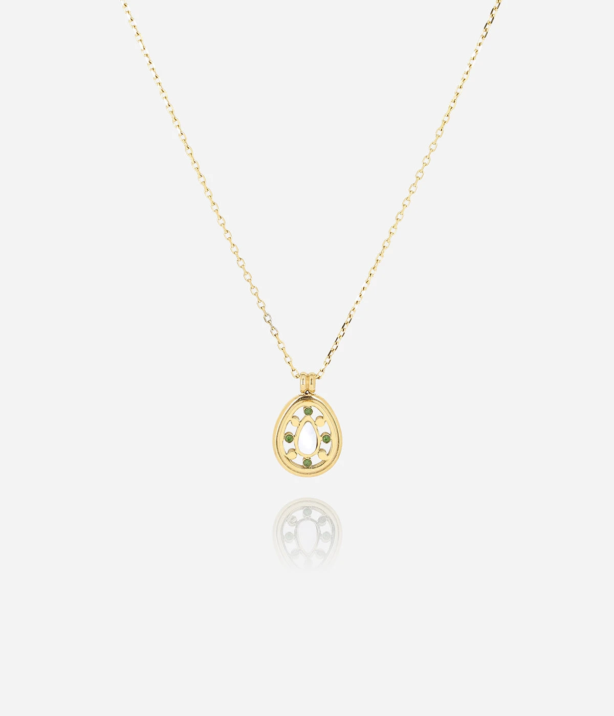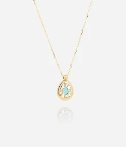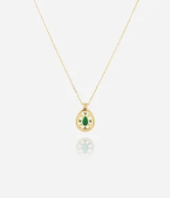 Collier en acier dorĂ© Ă l’or fin oĂč se trouve un pendentif composĂ© d’une pierre et de zirconiums colorĂ©s.