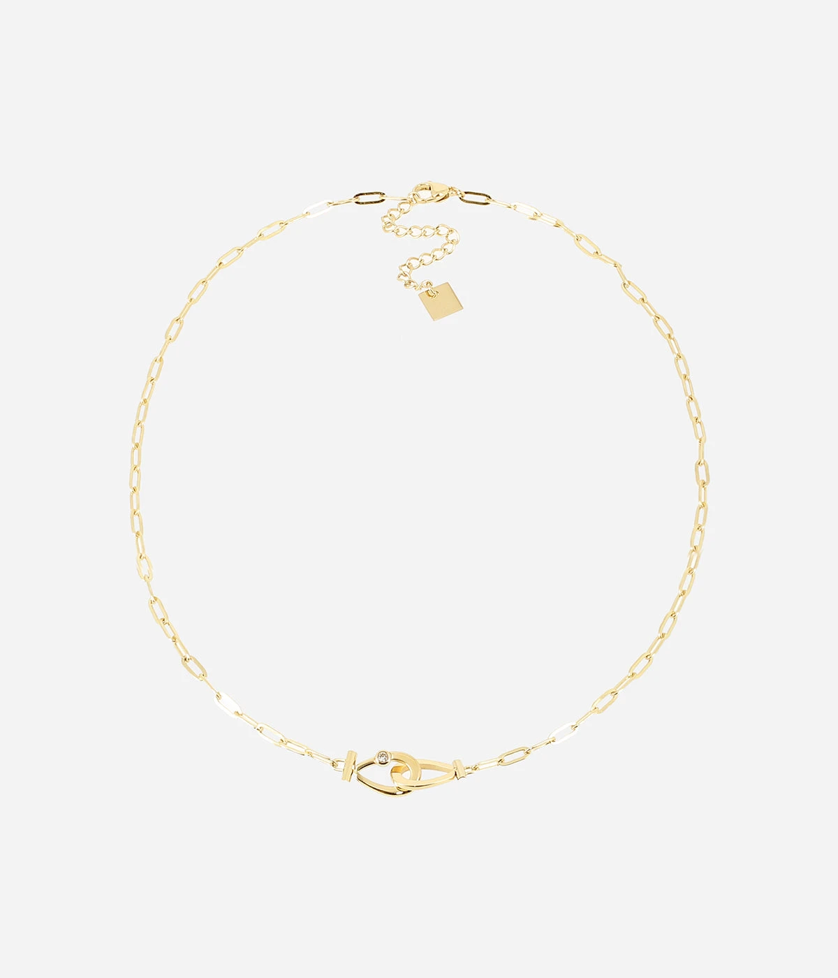 Collier maillons en acier dorĂ© Ă l’or fin oĂč deux motifs sont entrelacĂ©s. Le zirconium apporte une petite touche d’Ă©clat.