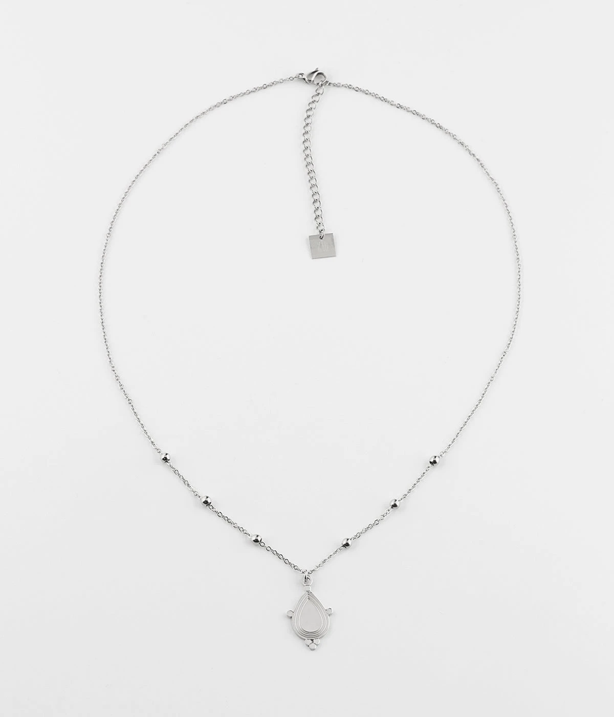 Collier chaĂźne chapelet en acier uni ou dorĂ© Ă l’or fin sur lequel est accrochĂ© un pendentif en forme de poire gravĂ©, agrĂ©mentĂ© de petites boules.