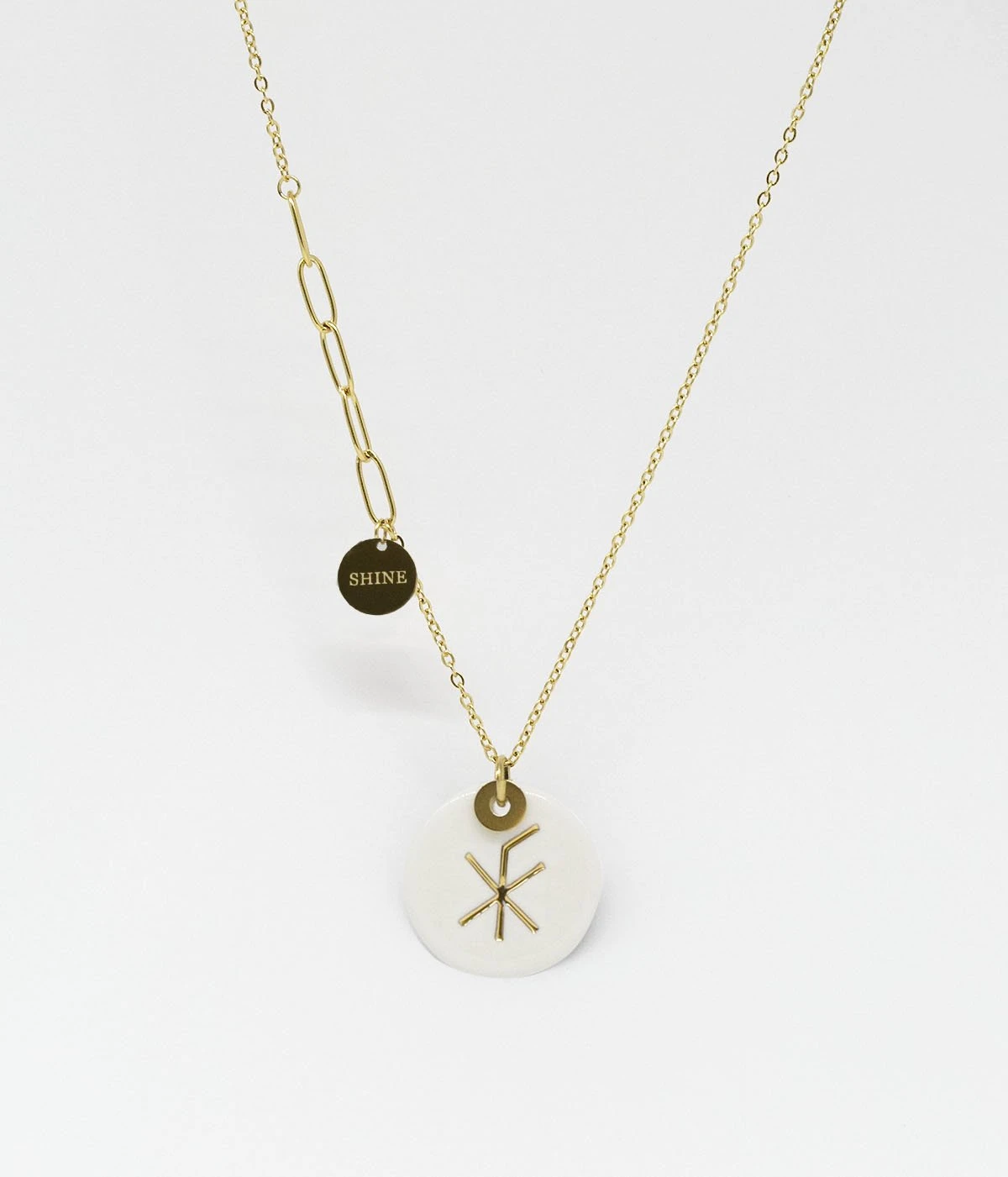 Ce collier chaĂźne mi-longue sur lequel est attachĂ© une plaque de cĂ©ramique rĂ©alisĂ©e Ă la main dans nos ateliers. Cette plaque est gravĂ©e dâun signe dorĂ© Ă lâor fin que lâon appelle un rune.