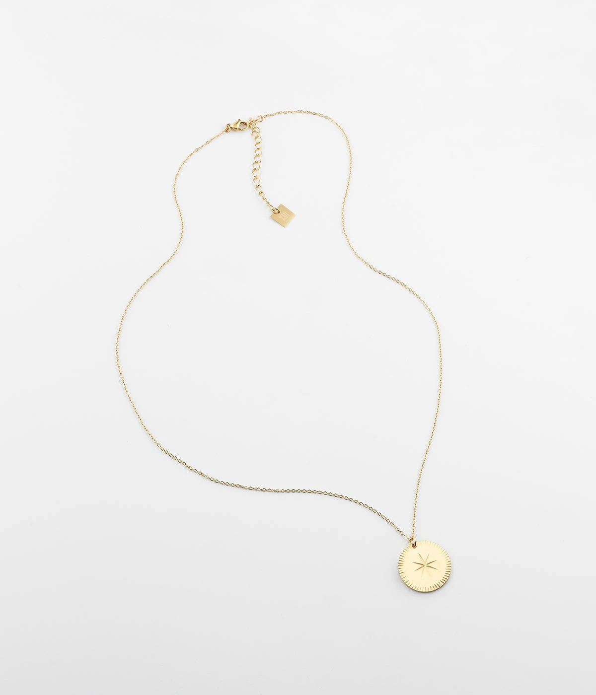 Collier chaîne en acier uni ou doré à l’or fin sur lequel est attachée une médaille finement gravée d’un motif astral.