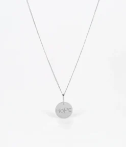 Collier chaĂźne en acier uni ou dorĂ© Ă lâor fin sur lequel une mĂ©daille gravĂ©e du mot « Hope » est attachĂ©e.