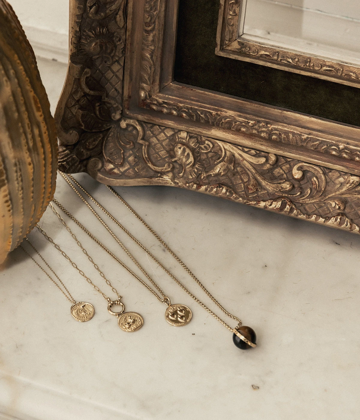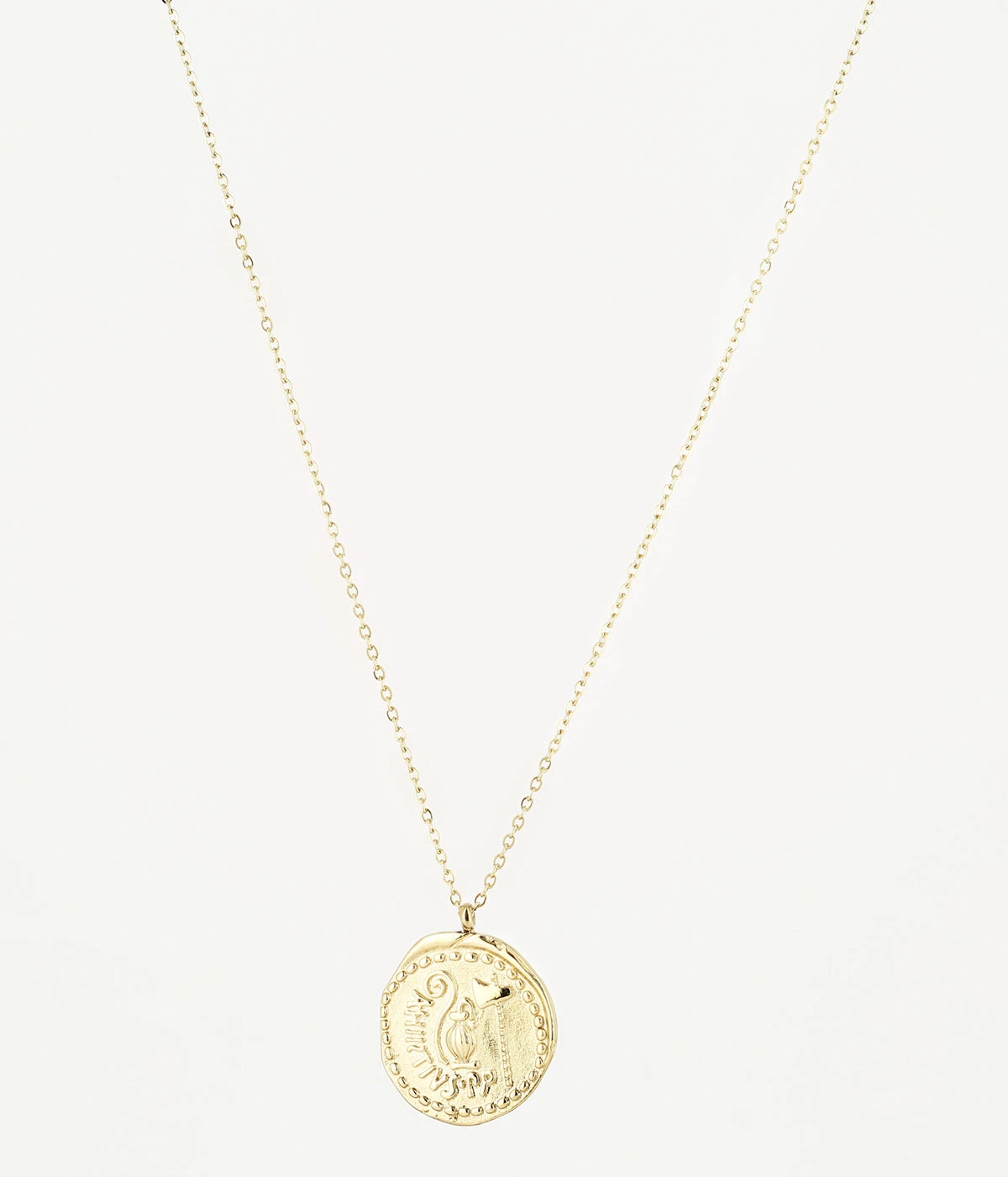 Collier en acier dorĂ© Ă l’or fin sur lequel est suspendu un mĂ©daillon dont la forme et les motifs rappellent l’antiquitĂ©.