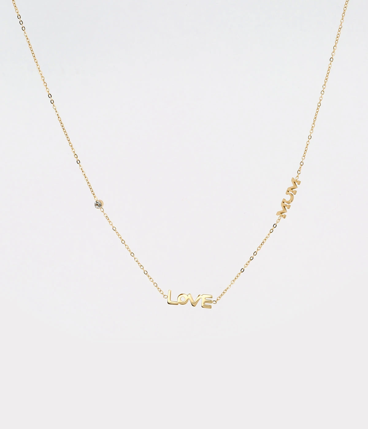 Collier chaĂźne en acier uni ou dorĂ© Ă lâor fin sertie d’un zirconium sur lequel sont attachĂ©s les mots âLove Mumâ.