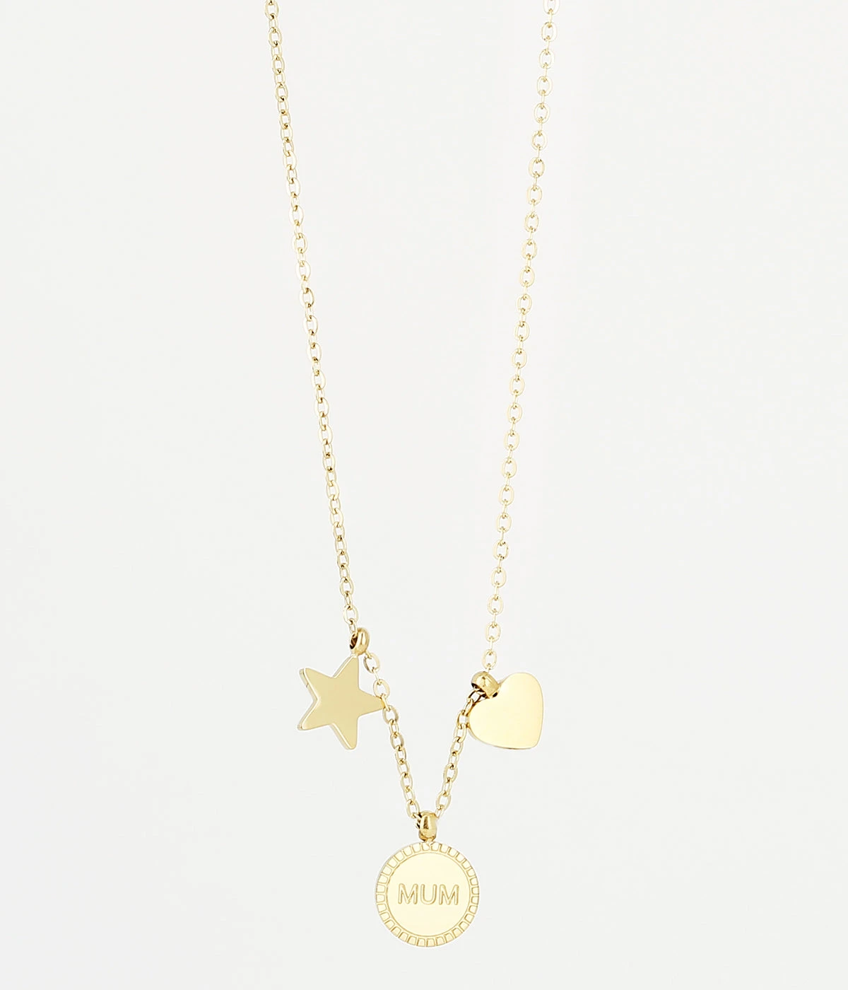 Collier chaĂźne en acier uni ou dorĂ© Ă l’or fin sur lequel sont attachĂ©es une petite mĂ©daille gravĂ©e avec le mot « Mum » et des petites pampilles en forme d’Ă©toile et de cĆur.