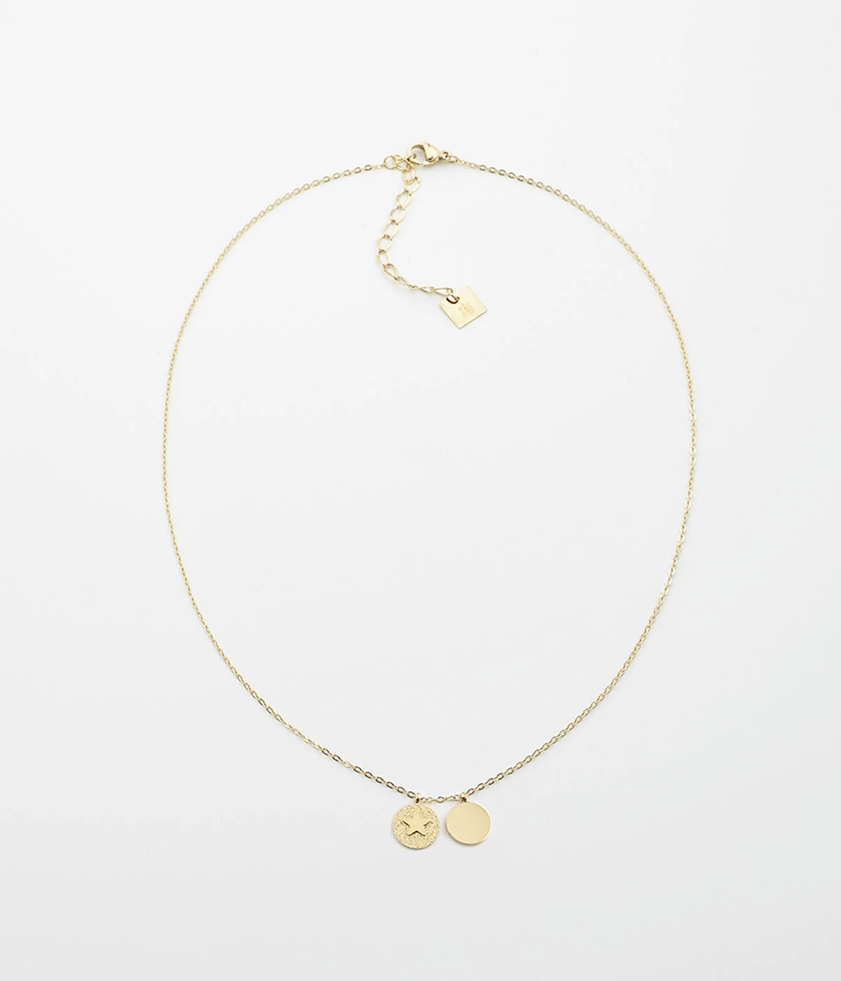 Collier chaĂźnette en acier dorĂ© Ă l’or fin sur lequel deux petites mĂ©dailles pampilles sont attachĂ©es, dont l’une est piquĂ© d’un motif Ă©toile.