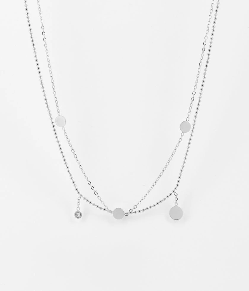 Collier double rang en acier uni sur lequel sont suspendues des petites pampilles et des zirconiums.