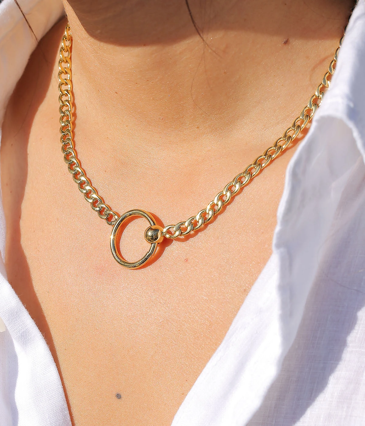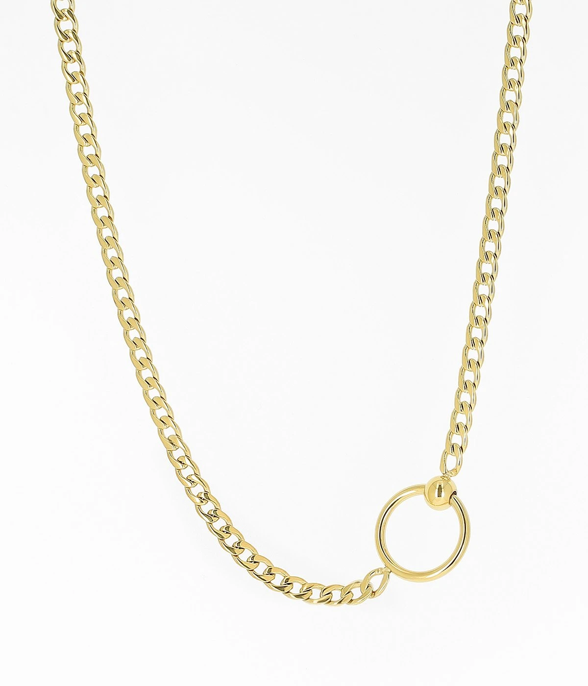 Collier chaĂźne « gourmette » en acier uni ou dorĂ© Ă lâor fin sur lequel est attachĂ© un cercle de mĂ©tal.